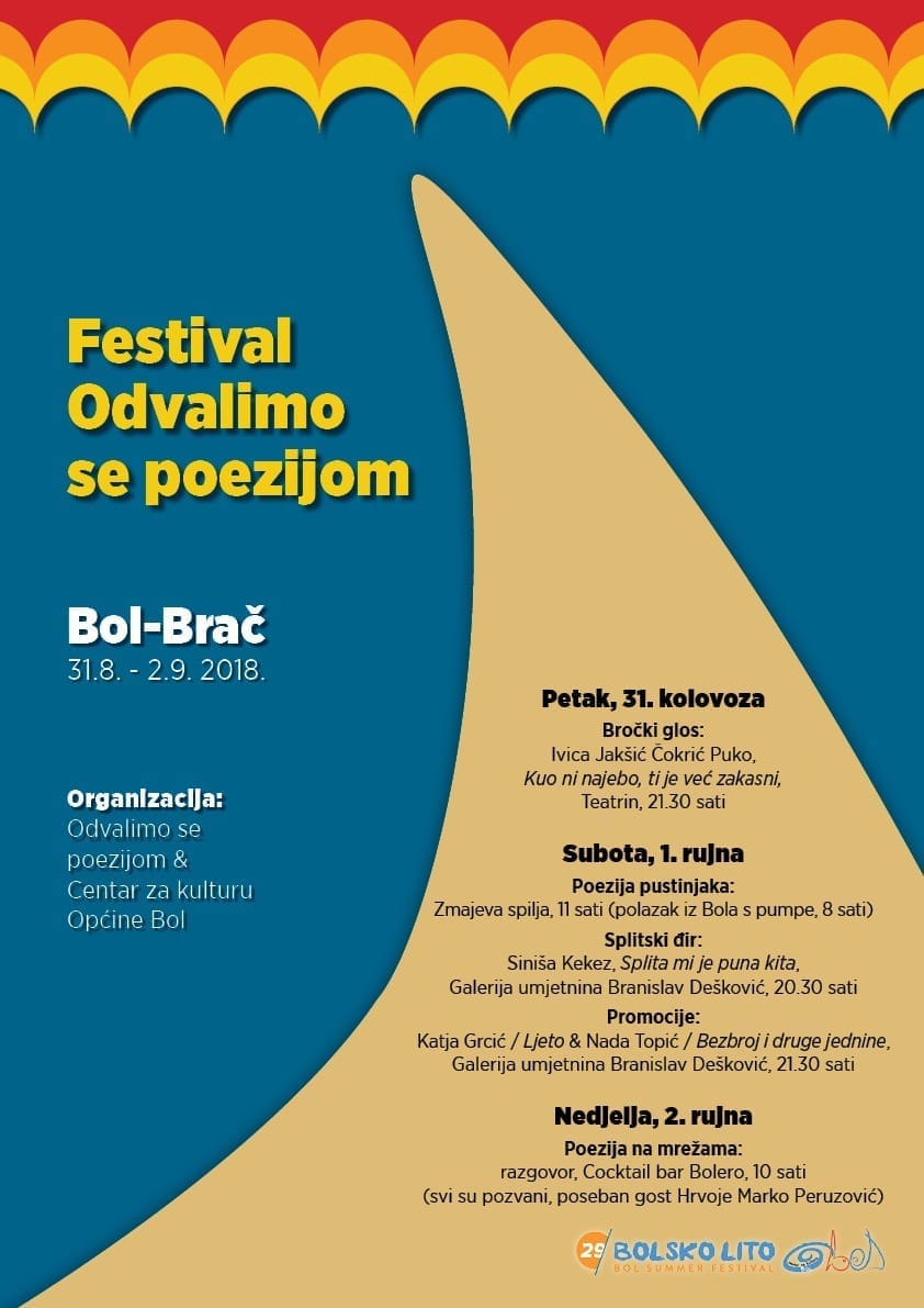 Drugu godinu zaredom pjesnički festival Odvalimo se poezijom održava se u Bolu na Braču, od 31. kolovoza do 2. rujna 2018. godine. Događanje je dio kulturne manifestacije 29. Bolsko lito, a sav program odvija se uz organizaciju i podršku Centra za kulturu Općine Bol. Projekt Odvalimo se poezijom započela je Sanja Baković na društvenoj mreži Facebook još 2015. godine, a potom je prerastao u žive pjesničke susrete.
