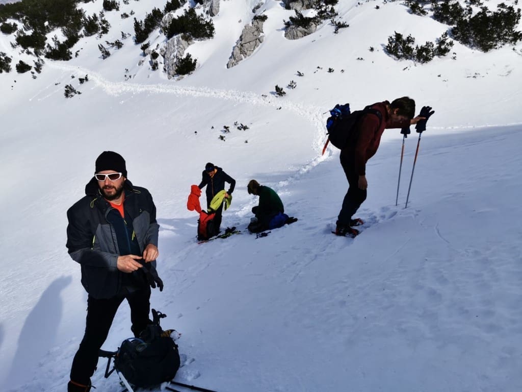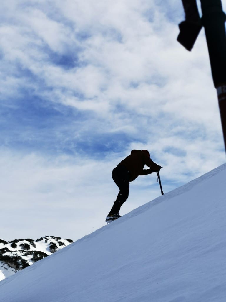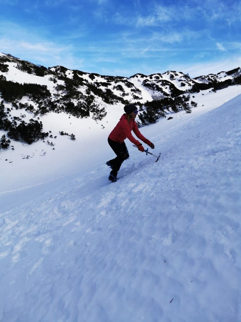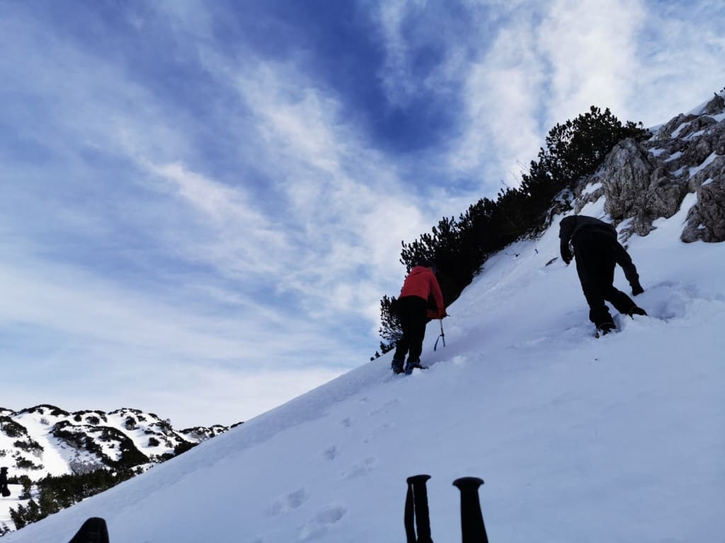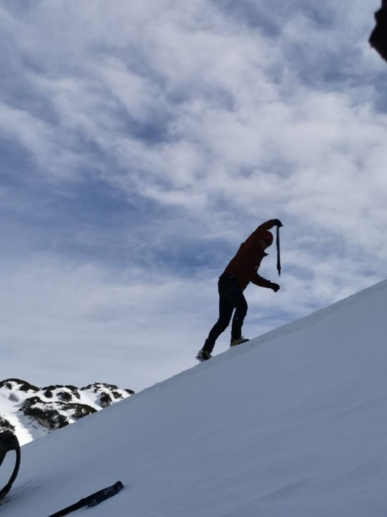 Glavni vodič grupe bio je Jure Rakuljić koji je odlučio naći povoljnu i neopasnu padinu da bi planinare naučio prvim visokogorskim zahvatima s cepinom. Jedna takva zaleđena padina nalazila se na oko 2000 metara nadmorske visine. Baciti se niz padinu i zaustaviti se cepinom na prvi pogled bio je pravi izazov za većinu, no kada je prvo "bacanje" nakon vodiča odradila planinarka, okuražili su se i ostali. To iskustvo još će dugo pamtiti. Do vrha (Pločno) se ipak nije išlo iz najmanje dva razloga. Prvi je bio sigurnosni, dio puta prema Pločnom bio je zaleđen, a drugi je dogovor s ostatkom grupe da se vrati u podnožje planine do 16 sati. Tako će Pločno ostati motiv za neko buduće planinarenje. Sretni i zadovoljni, 12 "visokogoraca" spustilo se do Dugog polja, a nemalo iznenađenje priredio im je ostatak grupe koji ih je dočekao baš kao prave zvijezde. Uspon na Čvrsnicu ujedno je bio začetak visokogorske sekcije u Gojzericama.