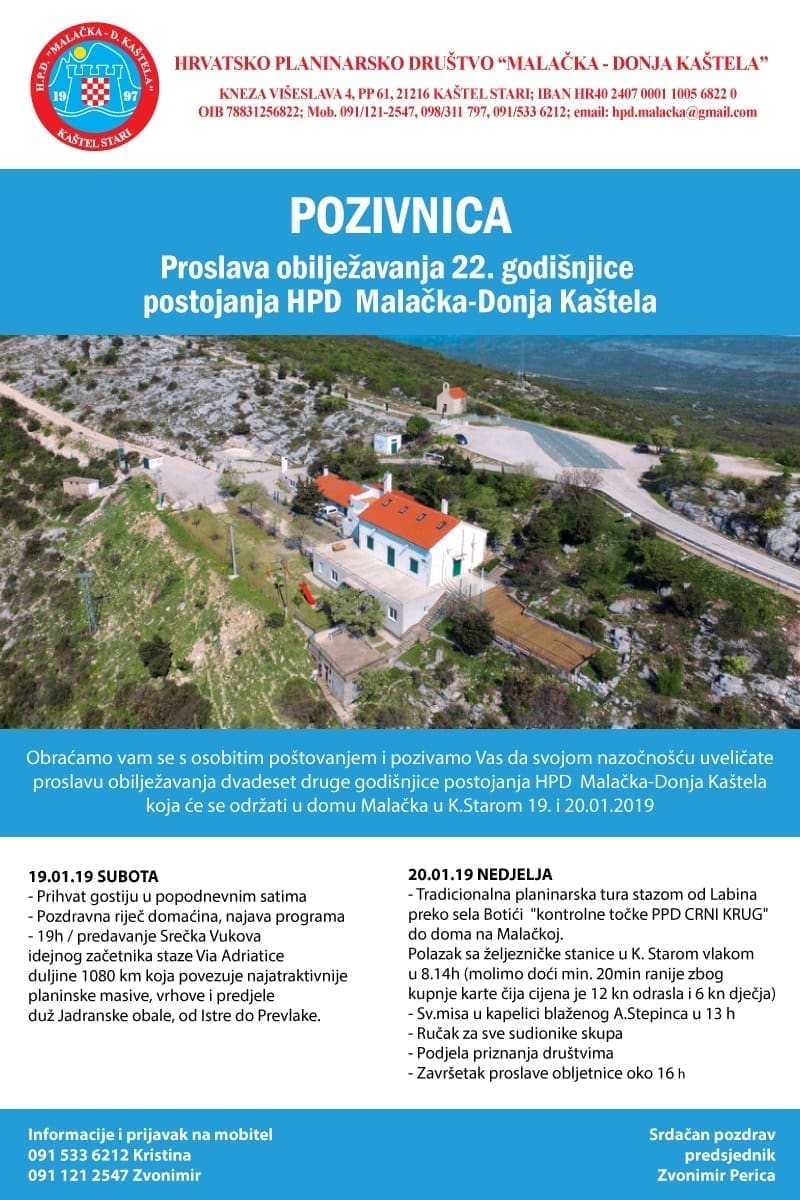 Hrvatsko planinarsko društvo Malačka iz Donjih Kaštela poziva na proslavu obilježavanja dvadeset druge godišnjice postojanja i kontinuiranog djelovanja. Proslava će se održati u Domu Malačka u Kaštel Starom 19. i 20. siječnja 2019. godine. Pozivaju se svi građani da uveličaju događanja i to kako slijedi: