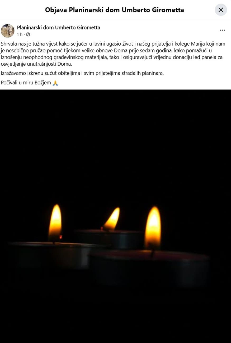 “Shrvala nas je tužna vijest kako se jučer u lavini ugasio život i našeg prijatelja i kolege Marija, koji nam je nesebično pružao pomoć tijekom velike obnove Doma prije sedam godina, kako pomažući u iznošenju neophodnog građevinskog materijala, tako i osiguravajući vrijednu donaciju led panela za osvjetljenje unutrašnjosti Doma.”