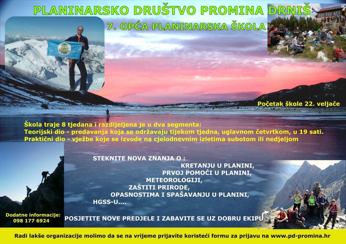 Opću planinarsku školu organizira Planinarsko društvo Promina. Opća planinarska škola je osnovni oblik obrazovanja planinara za sigurno i ugodno kretanje planinom, a svi zainteresirani su dobrodošli pridružiti se ekipi iz PD Promina kako bi usvojili osnovna znanja iz planinarstva te svoje prve korake napravili upravo na planini Promini, upoznati se s prirodom u kojoj će uživati, time i produbili svijest o potrebi njenog očuvanja.
