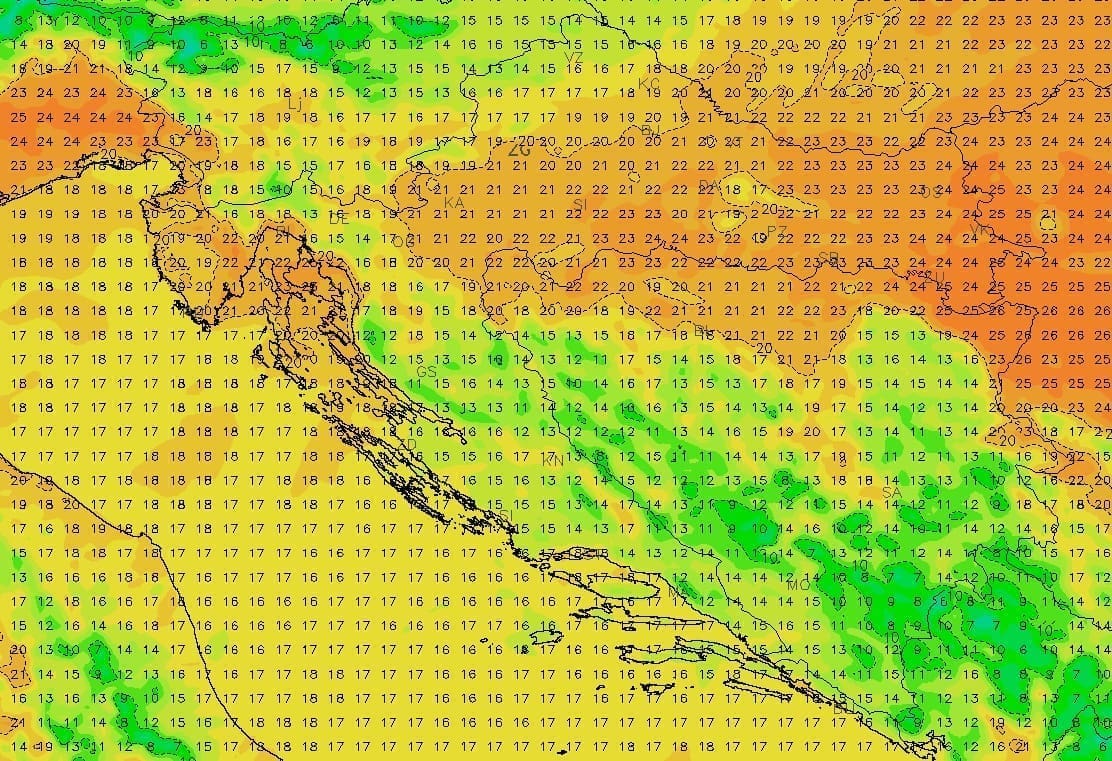 Gotovo identično će biti u utorak. Bit će vedro uz slab dnevni vjetar. Minimalne jutarnje temperature zraka od 6°C ponegdje u Dalmatinskoj zagori do 17°C ponegdje uz obalu. Najviše dnevne temperature od 21 do 27°C.