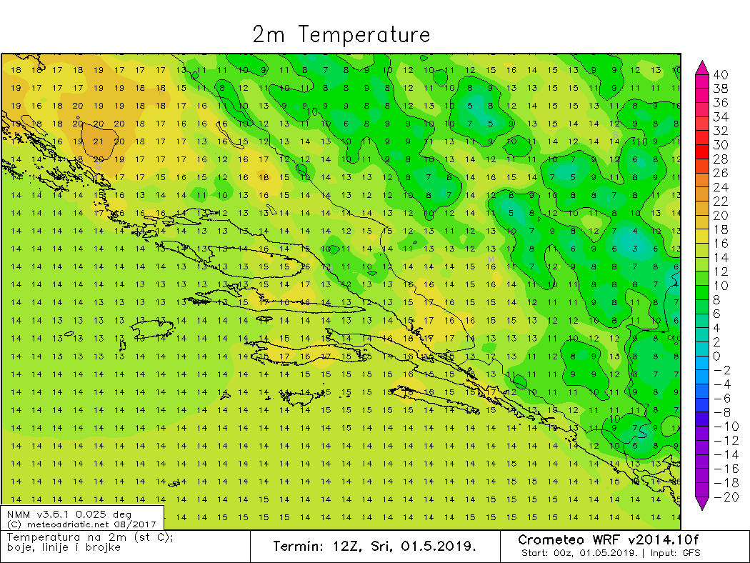Temperatura će izrazito ovisiti o tome hoće li biti sunca ili kiše, pa će u najtoplijem dijelu dana biti od 14 do 22°C.