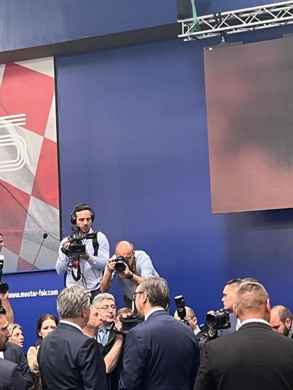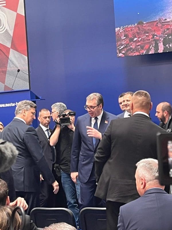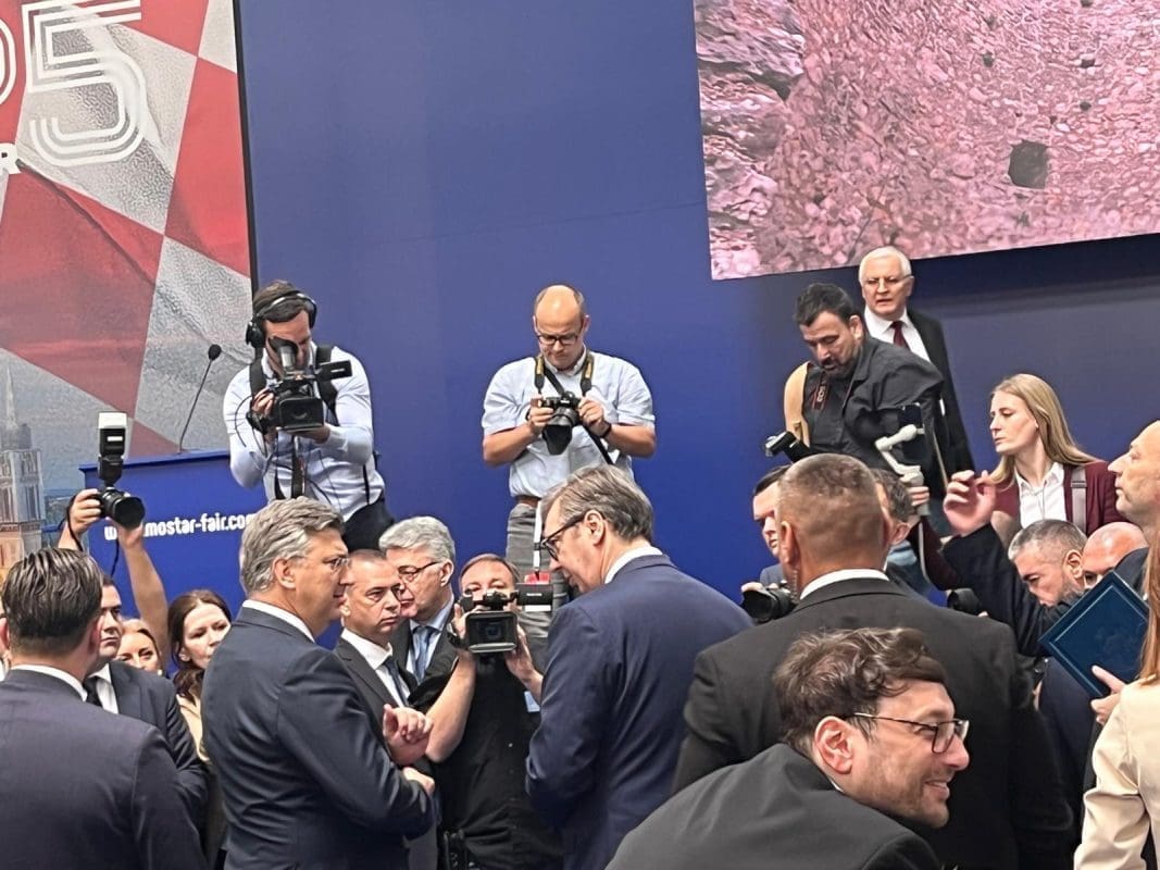 Predsjednik Srbije, Aleksandar Vučić koji je u Mostar stigao zrakoplovom Air Serbia koja je na taj način simbolično uspostavila zrakoplovnu liniju između Beograda i Mostara.