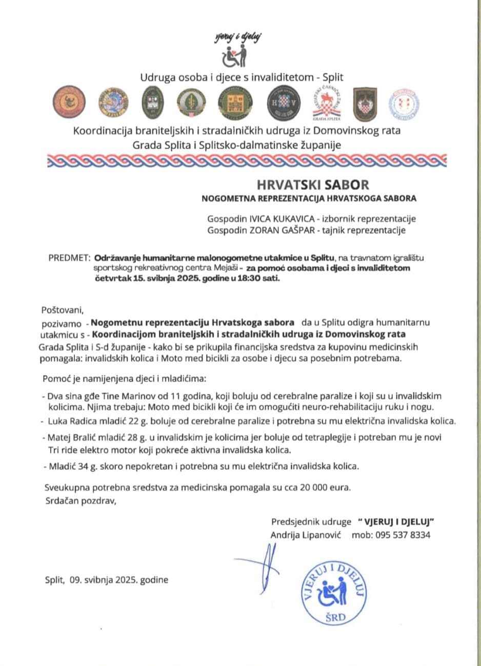 U 18:30 sati odigrat će se humanitarnoj malonogometnautakmica u organizaciji Udruge osoba i djece s invaliditetom – Split, Koordinacije braniteljskih udruga iz Domovinskog rata Grada Splita i Splitsko-dalmatinske županije te reprezentacije Hrvatskog sabora.