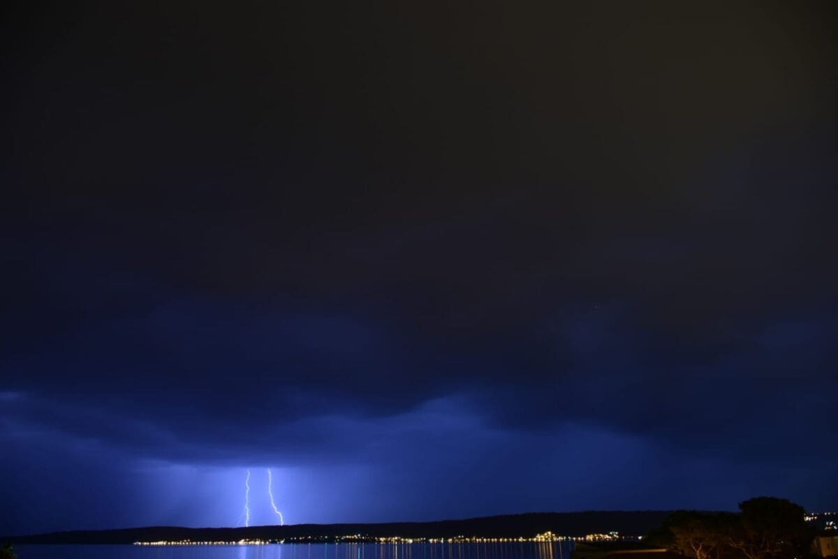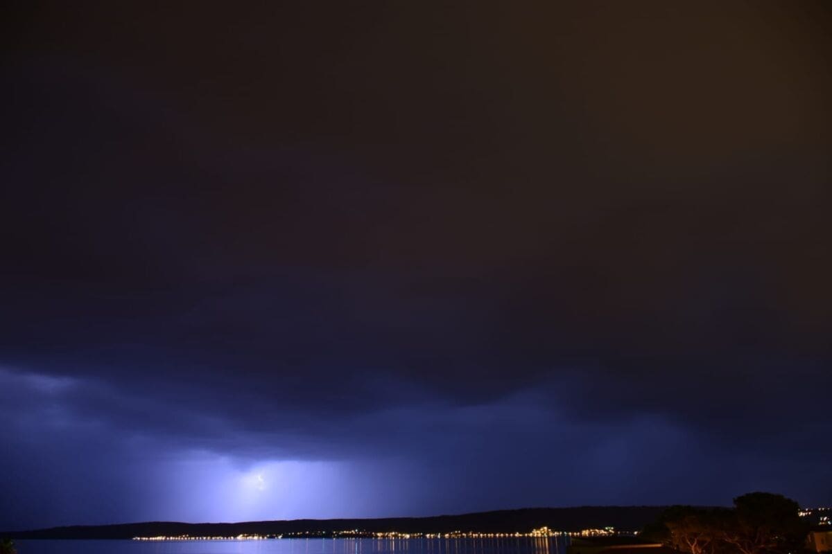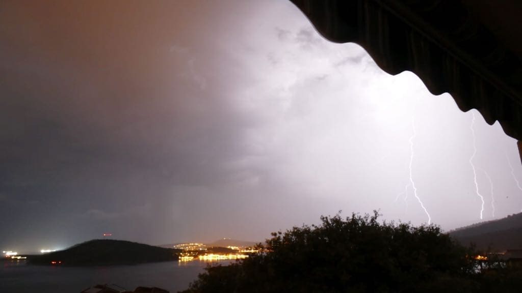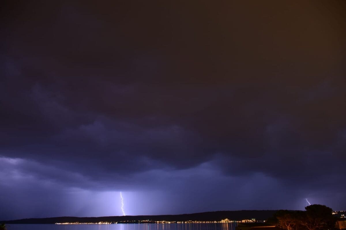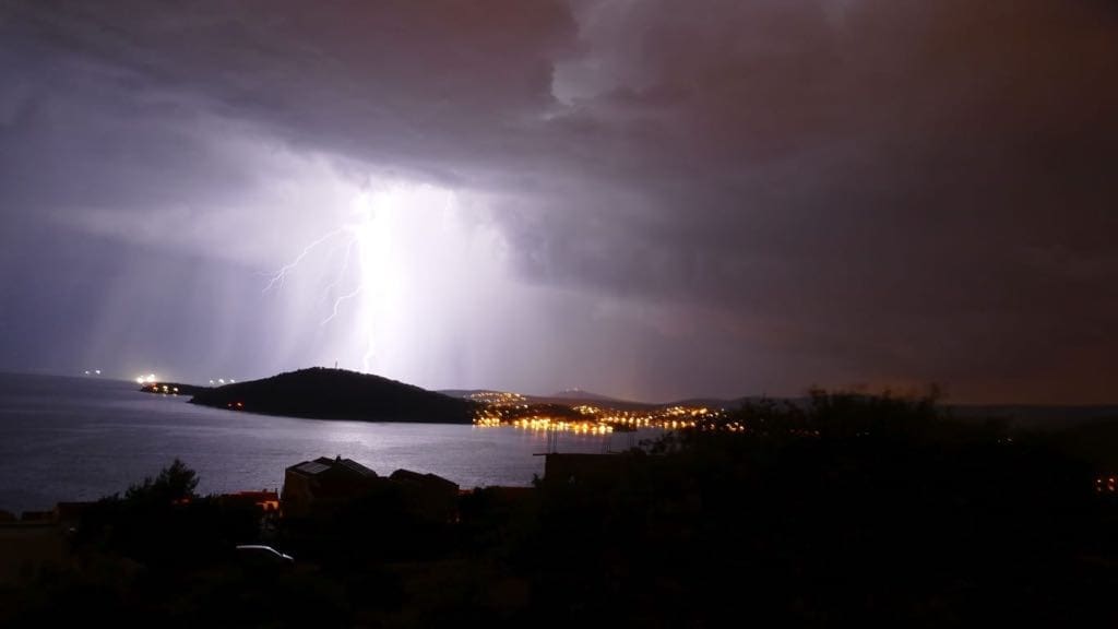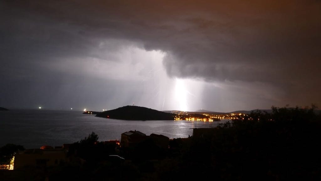 Dvadeset minuta prije ponoći u Splitu je zapuhao jak zapadnjak s olujnim udarima preko 70 km/h. Sljedeći sati donose mjestimice jako grmljavinsko nevrijeme u velikom dijelu Dalmacije, pa lokalno može pasti i preko 30 litara kiše po kvadratnom metru uz mjestimične bujice. Ne isključuje se ni pojava tuče niti pijavica na moru.