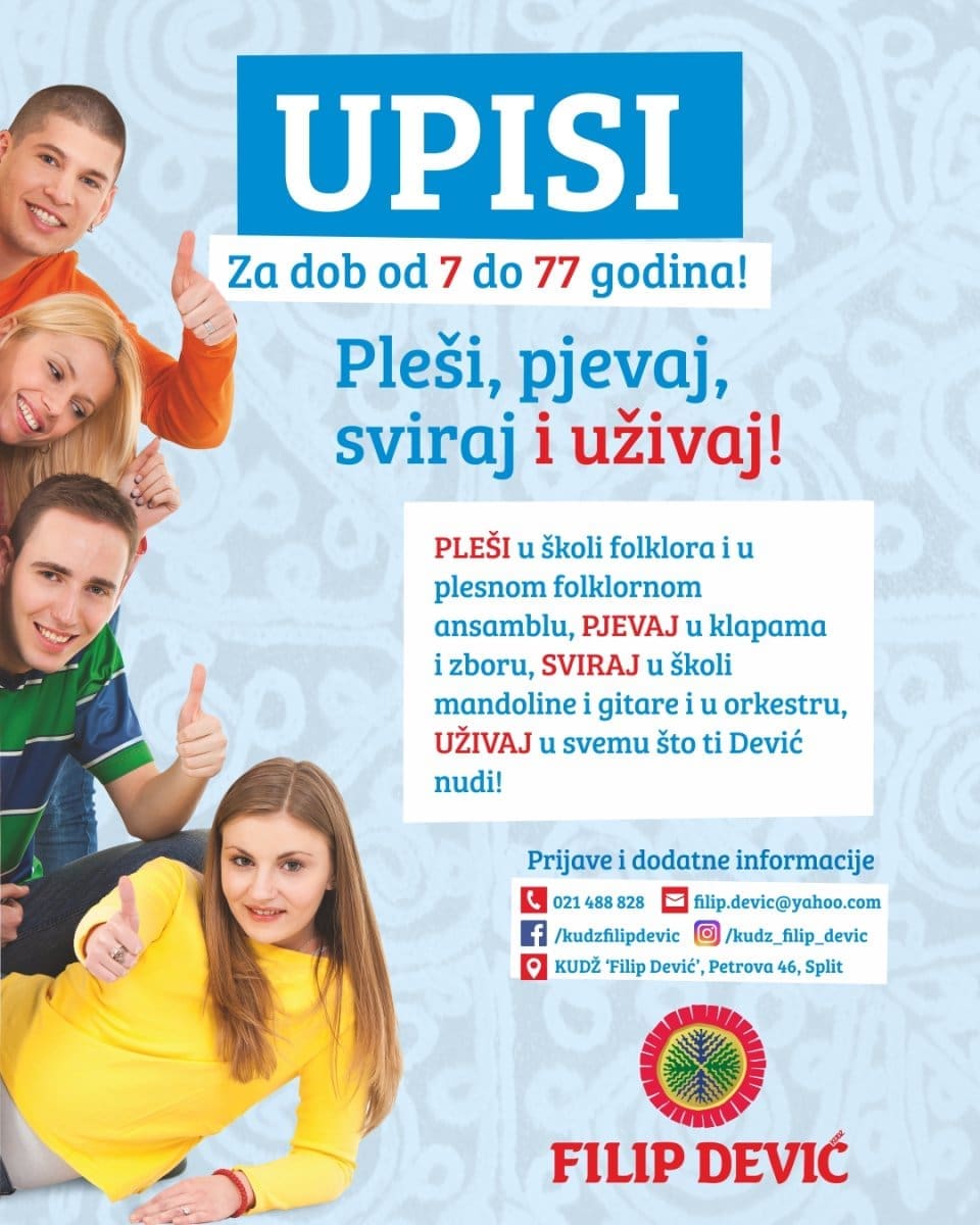 Splitski KUDŽ "Filip Dević" upisuje nove članove u sve svoje sekcije. Ako želiš postati član škole folklora, škole mandoline i gitare, plesnog-folklornog ansambla, orkestra, mješovitog zbora ženske, muške ili mješovite klape, javi nam se i postani član velike Devićeve obitelji.