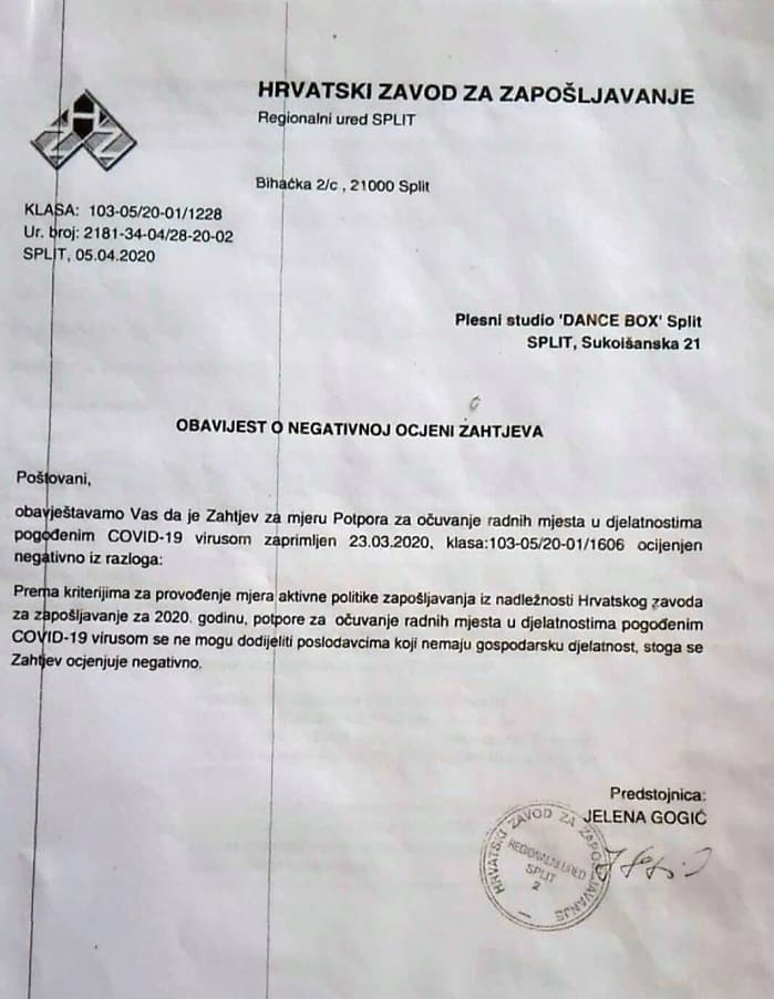 - Djelujem u studiju kao umjetnički voditelj i koreograf i zaposlena sam na puno radno vrijeme već osam godina. Zbog poznate situacije s pandemijom, poput mnogih mojih kolega, a ima nas u grupi više od šest stotina, zatražila sam od HZZ-a potporu za očuvanje radnih mjesta. Nakon dva dana dobila sam odbijenicu uz obrazloženje da mi kao udruga nismo gospodarska djelatnost - ispričala nam je Ines Mamić, vlasnica plesnog studija Dancebox, te dodala da se financira isključivo od članarina i kako ima sredstava za samo još jednu plaću.