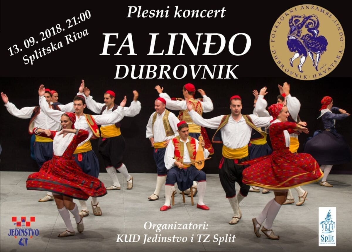 Ovog četvrtka (13. rujna) s početkom u 21:00 sati, FA Linđo će se na središnjoj pozornici splitske Rive predstaviti našim sugrađanima i njihovim gostima svojim cjelovečernjim koncertom. Bit će to program posebno osmišljen za nastup u Splitu, a valja istaknuti da nam Linđovci dolaze s ukupno 55 članova svog folklornog ansambla i pratećeg orkestra koji će na ovom koncertu izvesti niz poznatih koreografija sa svog repertoara poput Valpovačkih plesova, Dubrovačke kontradance, Istarskog baluna, Plesova iz Zaprešića i naravno njihovu najpoznatiju i najprepoznatljiviju koreografiju Dubrovačku poskočicu Linđo.
