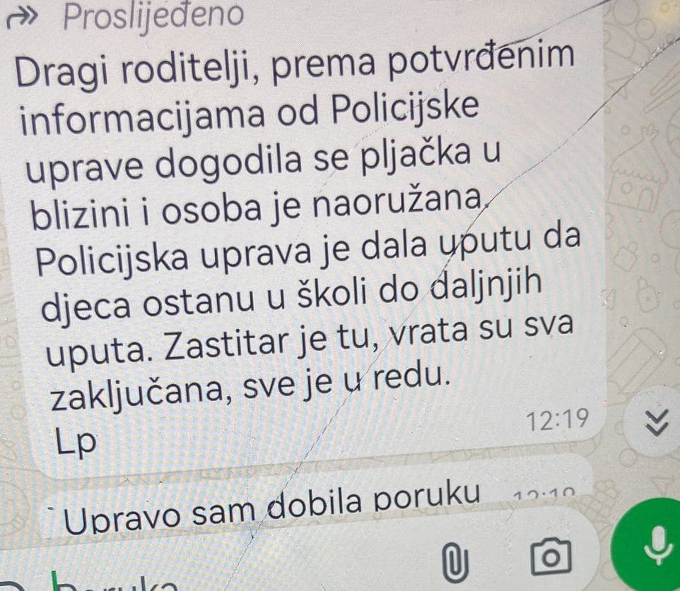 "Dragi roditelji, prema potvrđenim informacijama od Policijske uprave dogodila se pljačka u blizini i osoba je naoružana. Policijska uprava je dala uputu da djeca ostanu u školi do daljnjih uputa. Zaštitar je tu, vrata su sva zaključana, sve je u redu", piše u poruci koju su primili roditelji.