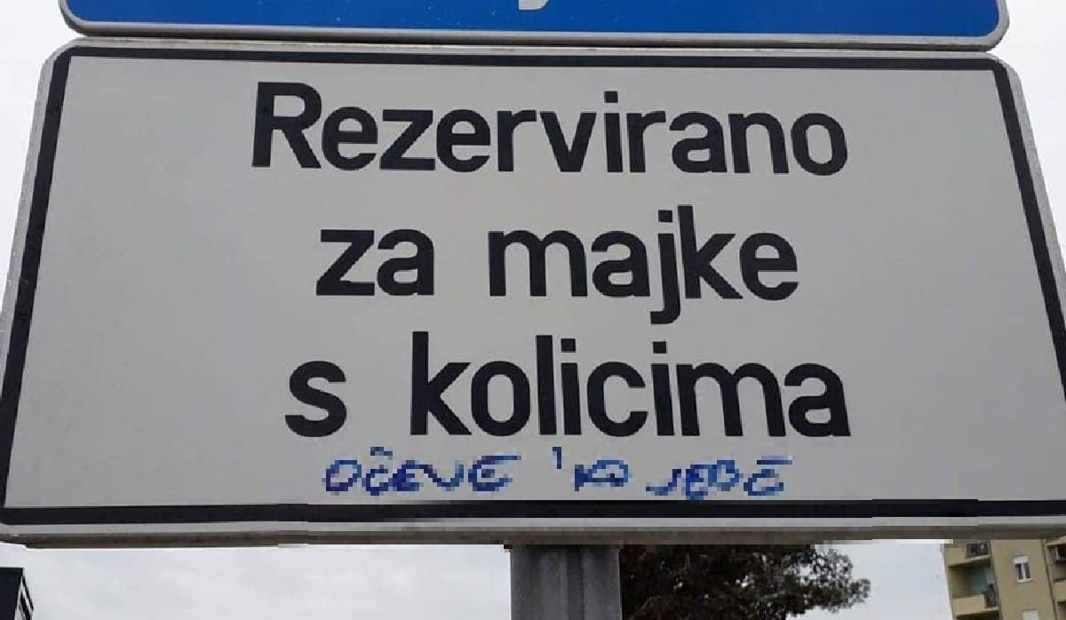 Znak je to na koji možemo često naići u prometu, a očito je da nije svakome po volji. Tako je ovaj "uvrijeđeni" otac na njega flomasterom napisao: "Očeve ko j**e", vjerojatno zbog toga što i on u kolicima izvodi svoje dijete na svježi zrak.