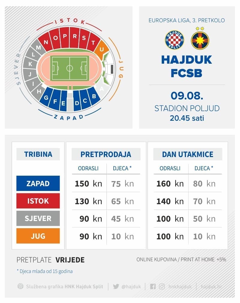 Ulaznice do nedjelje mogu kupiti samo članovi Hajduka, a od ponedjeljka će biti u slobodnoj prodaji.