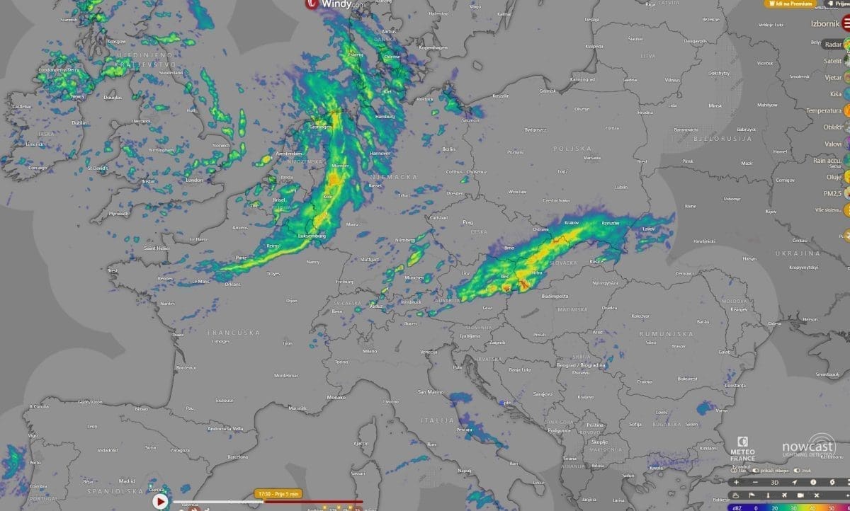 Radarska snimka oborina u 16 sati otkriva da je hladna fronta zahvatila zapadnu Europu. Tako su zemlje Beneluksa, sjeveroistok Francuske i sjeverozapad Njemačke među prvima dobili osjetno zahlađenje. U dijelovima Belgije i Nizozemske u vrijeme pisanja teksta mjere se tek 4 stupnja Celzijusa. To zahlađenje jako će brzo napredovati kontinentom i postupno stići i do nas. U Hrvatskoj će prvi zahvatiti Međimurje u utorak, a u srijedu će se prošiti cijelom zemljom.