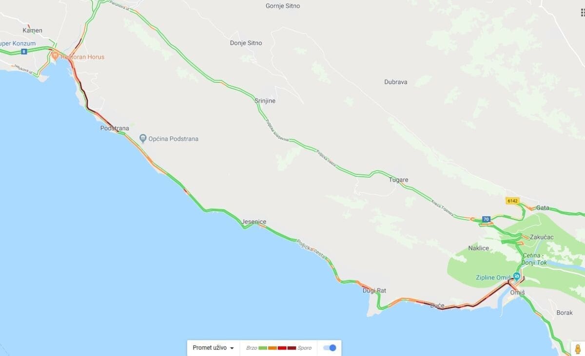 Uobičajeno, gužve su najizraženije od Duća do Omiša, a promet je gust i kroz Strožanac, u smjeru Splita.