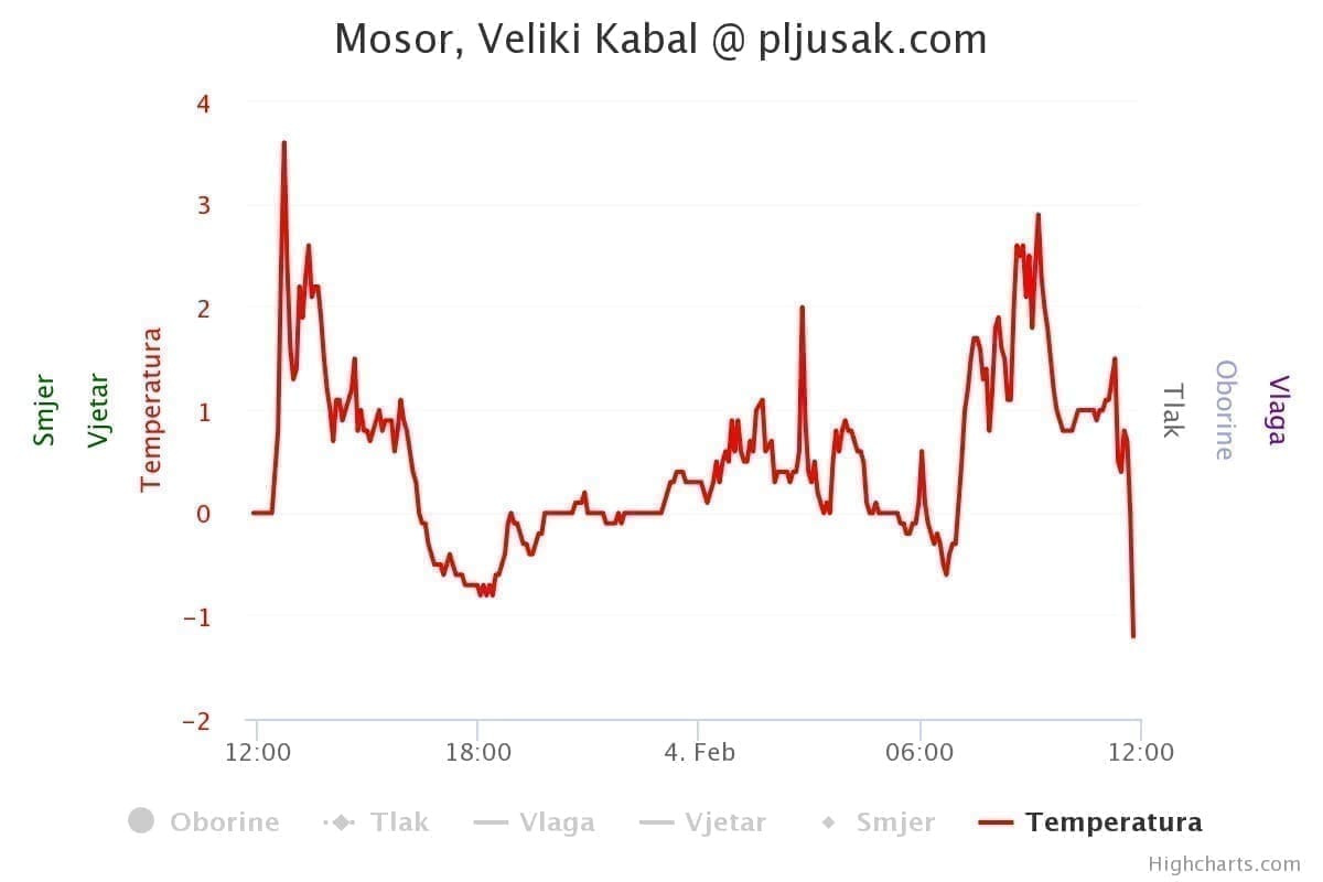 O tome koliko je izražen pad temperature zraka, svjedoči podatak da je na Velikom Kablu, najvišem vrhu Mosora, temperatura zraka u svega pola sata pala na -2 stupnja uz snažan trend daljnjega pada.