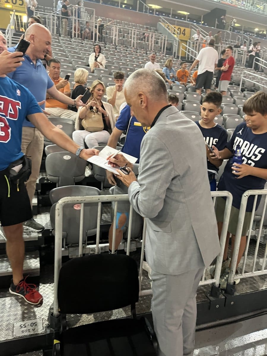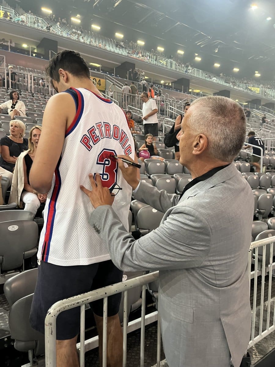 Aleksandar Petrović, Draženov brat i proslavljeni košarkaški trener, već je u dvorani i rado se fotografira s obožavateljima, dok potpisuje dresove i uspomene na legendarne trenutke hrvatske košarke.