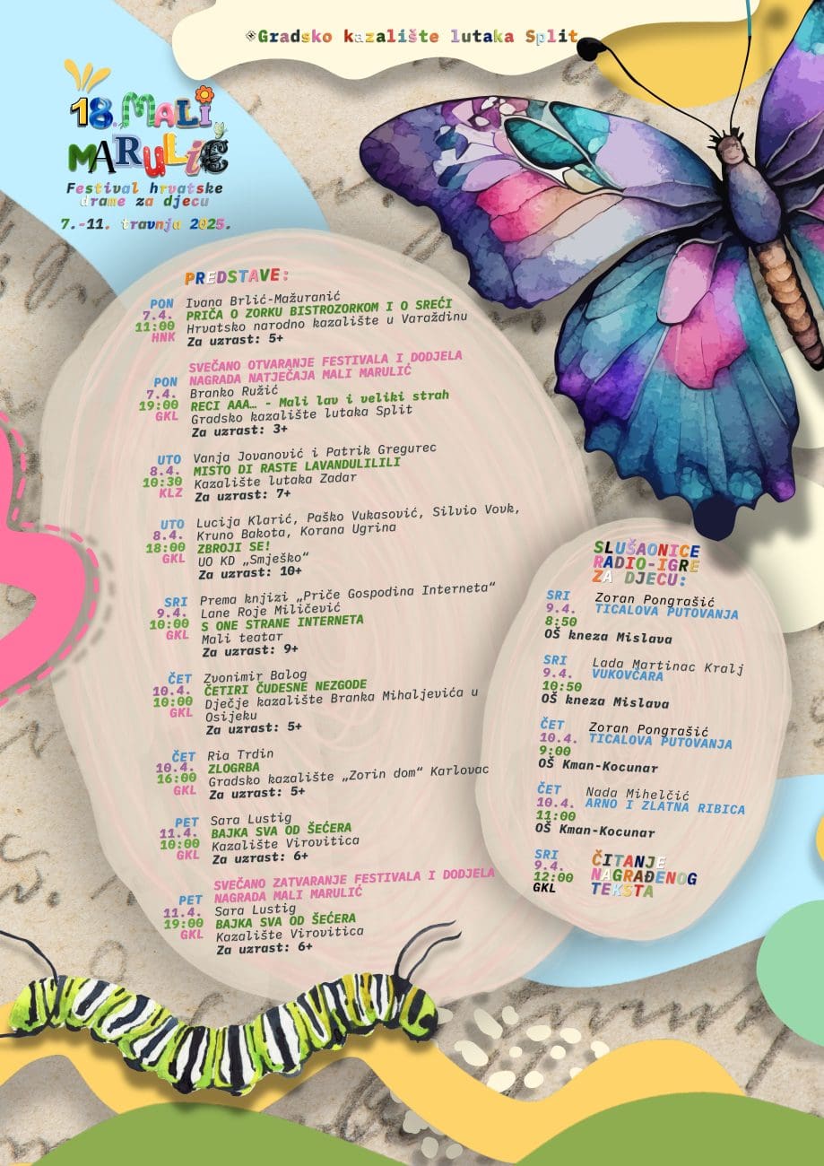 U ponedjeljak, 7. travnja, počinje osamnaesto izdanje Festivala hrvatske drame za djecu "Mali Marulić", u organizaciji Gradskog kazališta lutaka Split. Tijekom pet dana Festivala bit će izvedeno osam predstava namijenjenih publici različitih uzrasta.