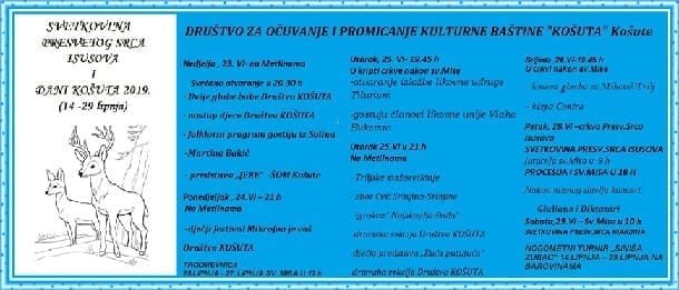Društvo za očuvanje i promicanje kulturne baštine ‘Košuta’ – Košute organizira prigodni kulturno-zabavni program, koji počinje sutra, 23. lipnja i koji će trajati do 29. lipnja 2019. Svečanost otvaranja manifestacije održat će se na Metlinama u 20,30 sati. U nastavku programa članovi Društva Košuta izvest će skeč ‘Dvije gluhe babe’, nastupit će i djeca Društva Košuta, a folklorni program izvest će gosti iz Solina. U zabavnom dijelu programa nastupit će Martina Bakić, a potom će ŠOM Košute izvesti predstavu ‘Jere’.