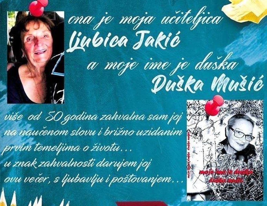 "Više od 50 godina zahvlna sam joj na naučenom slovu i brižno uzidanimm prvim temeljima života. U znak zahvalnosti darujem joj ovu večer, s ljubavlju i poštovanje" napisala je organizatorica Duška Mušić.