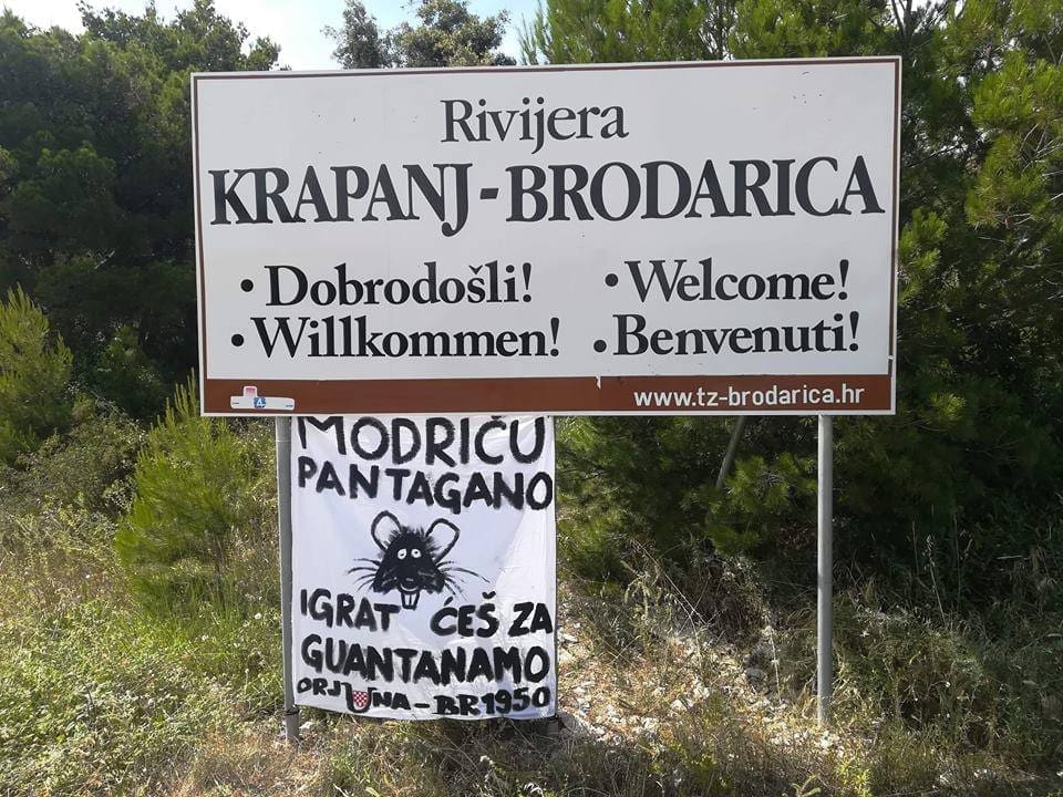 Nakon jutrošnje splitske podrške, na redakcijski e-mail dobili smo fotografije podrške i iz Brodarice kod Šibenika. Na ulazu u mjesto izvješeni su transparenti podrške kapetanu Luki Modriću, protiv kojeg je dignuta optužnica za lažno svjedočenje u slučaju Zdravka Mamića, nepravomoćno osuđenog na 6 i pol godina zbog izvlačenja novca iz Dinama. Na transparentu stoji poruka "Modriću pantagano igrat ćeš za Guantanamo" uz potpis "Orujna-BR1950".