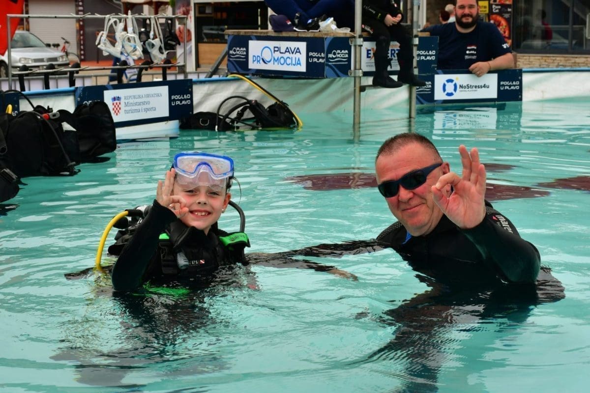 Nakon poduke o osnovnim pravilima ronjenja te ronilačkoj opremi posjetitelji su uz instruktore ronjenja zaronili u bazen te razgledavali ljepote hrvatskog podmorja kroz podvodnu izložbu fotografija Marjana Radovića koja se nalazi u bazenu te pridonosi stvarnom osjećaju dubine. Pogledu u plavo posebno su se razveselila djeca koja su s nestrpljenjem čekali na svoj prvi zaron i upoznavanje s ronilačkom opremom uz sigurnost ronioca Ronilačkog kluba HRVI Nemo-Adriatic i ronilačkog tima Plave promocije.