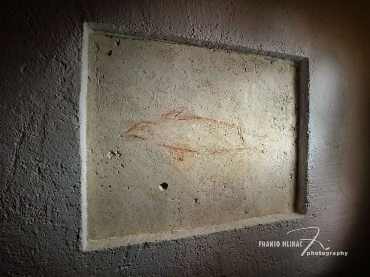 Ono manje poznato što ova crkvica krije je crtež u žbuci izvornog južnog zida stare bazilike. Otkriven je prilikom obnove crkvice 1980. godine kada je skidana stara žbuka i u njoj otkriven stariji sloj morta. Dio sa crtežom ostavljen je u izvornom obliku na mjestu gdje se i nalazio desno od ulaza u crkvu. Na njega se uvijek referiralo kao na crtež ribe, jednog od najstarijih kršćanskih simbola, međutim pažljivim promatranjem vidi se da je vjerojatno riječ o crtežu morskog čovika ili sredozemne medvjedice (Monachus monachus), nekada česte u Jadranu a danas dovedene na rub izumiranja u čitavom Mediteranu. Tu pretpostavku su potvrdili i slovenski arheolozi koji su istraživali antički brodolom sarkofaga nedaleko Sutivana, a vidjeli su sličan prikaz u crkvicama slovenskog primorja. Ovaj rijedak i zanimljiv nalaz iz vremena kasne antike sigurno će u budućnosti biti predmetom detaljnijeg istraživanja a za sada ga ubrajamo u još jednu stivansku zanimljivost koja nas povezuje s bogatom tisućljetnom povijesti našega podneblja.