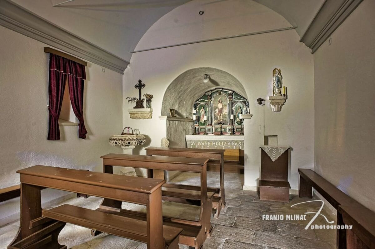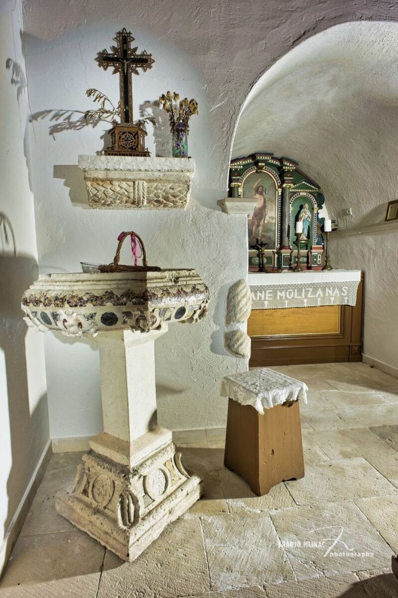 Skromnim ali skladnim interijerom današnje crkvice izgrađene 1655. godine dominira raskošni drveni oltar sa pozlatama restauriran 1989. godine. Pod nadzorom konzervatora u njegovu su obnovu stivanjani Roko Zuanić, Josip Lukšić i Frane Ljubetić uložili ukupno 600 radnih sati. 2012. godine zalaganjem Crkovinarstva crkvici je napravljen i novi krov te obnovljen lijepi bačvasti svod. U njoj se nalazi i skladna kamena krstionica sa mramornim intarzijama te fragmenti kasnogotičkih kapitela ugrađeni u zidove ispred oltara.