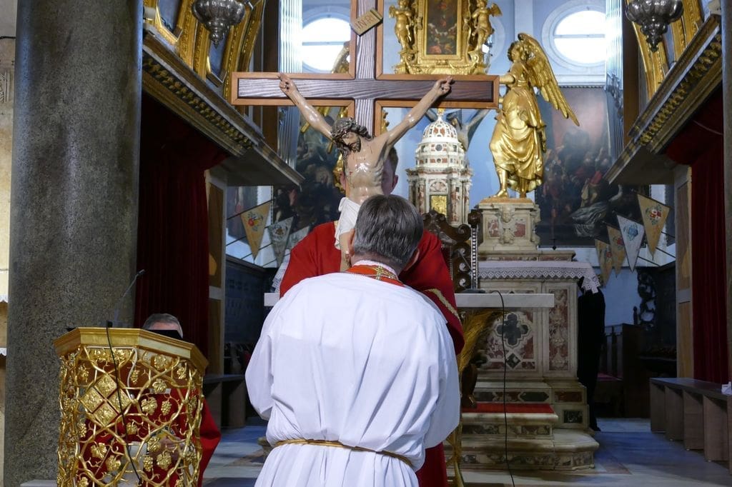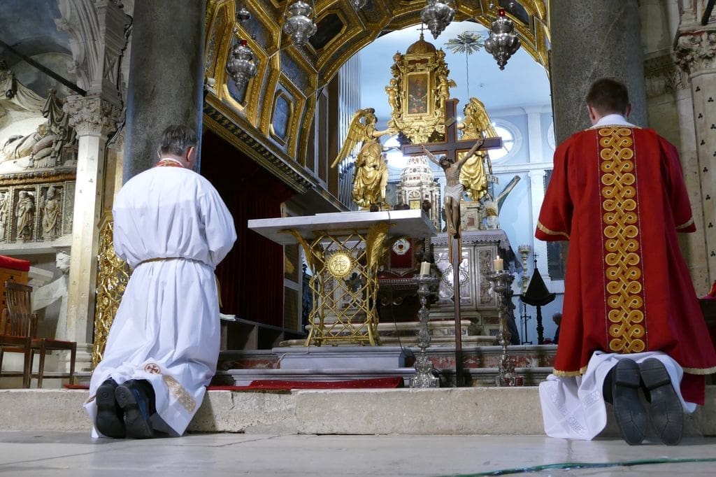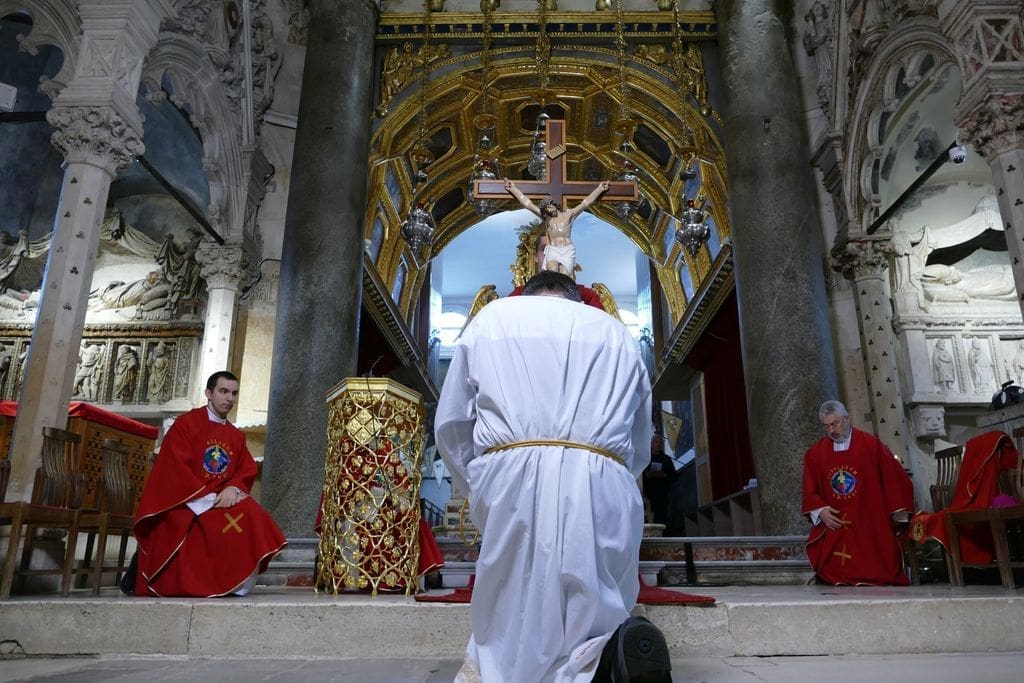 Obrede Velikoga petka u splitskoj prvostolnici sv. Dujma predvodio je, 10. travnja, splitsko-makarski nadbiskup i metropolit mons. Marin Barišić uz sudjelovanje kancelara Splitsko-makarske nadbiskupije don Ratomira Vukorepe, katedralnog župnika don Tomislava Ćubelića, don Ante Mateljana i đakona don Nikole Šakića. Nakon prostracije i šutnjom iskazane počasti Kristu umrlom na križu za spas svijeta, uslijedila je Služba riječi. Prije ljubljenja križa koje je pratilo pjevanje tradicionalne tužaljke „Puče moj“ i obreda pričesti, mons. Barišić je izrekao homiliju.