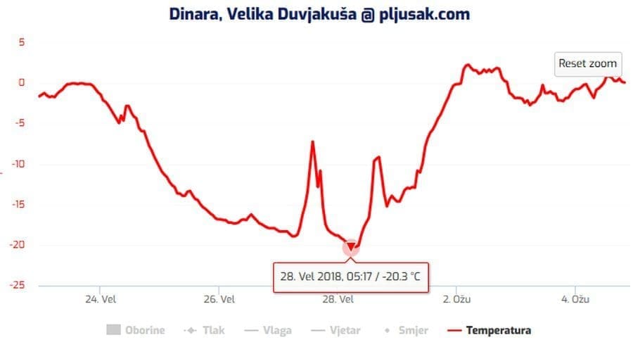 Posljednjih desetak dana na Dinari su vladali pravi ekstremni uvjeti. Prisjetimo se, temperature zraka su u višim dijelovima planine padale ispod -20 stupnjeva. Konkretno, na meteorološkoj postaji kod planinarskog skloništa Puma (1630 mnv), ispod vrha Velika Duvjakuša, izmjereno je -20,°C. U kombinaciji s olujnom burom, osjet hladnoće padao je do -45 Celzijevih stupnjeva. Posljednja dva dana na Dinari je zatoplilo do 0 stupnjeva, no pale su nove obilne snježne oborine. Na ovoj lokaciji visina snijega bez nanosa prelazi metar, a nanosi u nekim dijelovima planine su višemetarski.