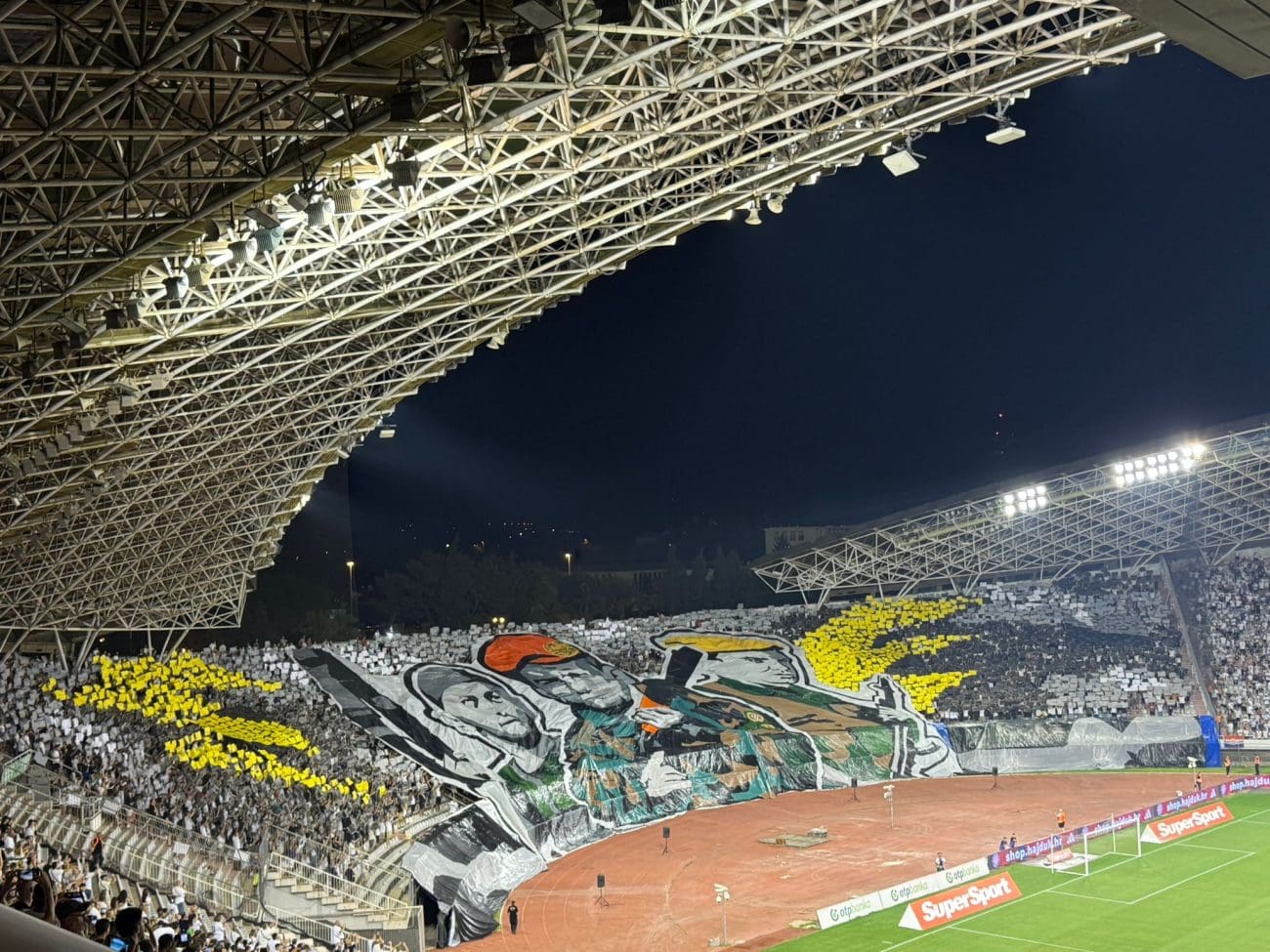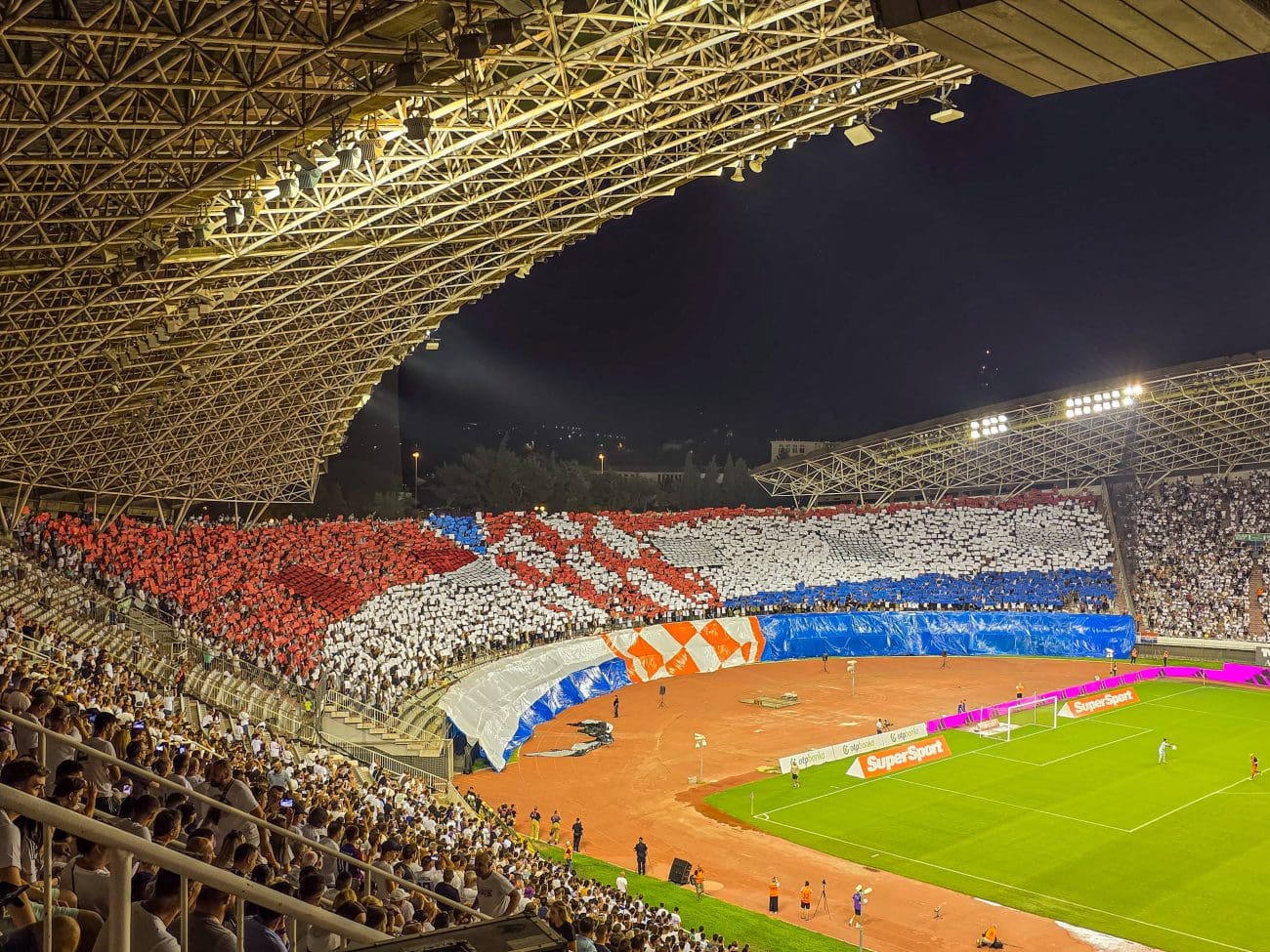 Torcida je krenula s pjesmom Moja domovina, a istok i zapad držali su ritam pljeskom. Nakon što je taj dio koreografije bio gotov, na sjevernoj je tribini podignuta je trobojnica sa šahovnicom. Uistinu spektakularan prizor i za svaku pohvalu.