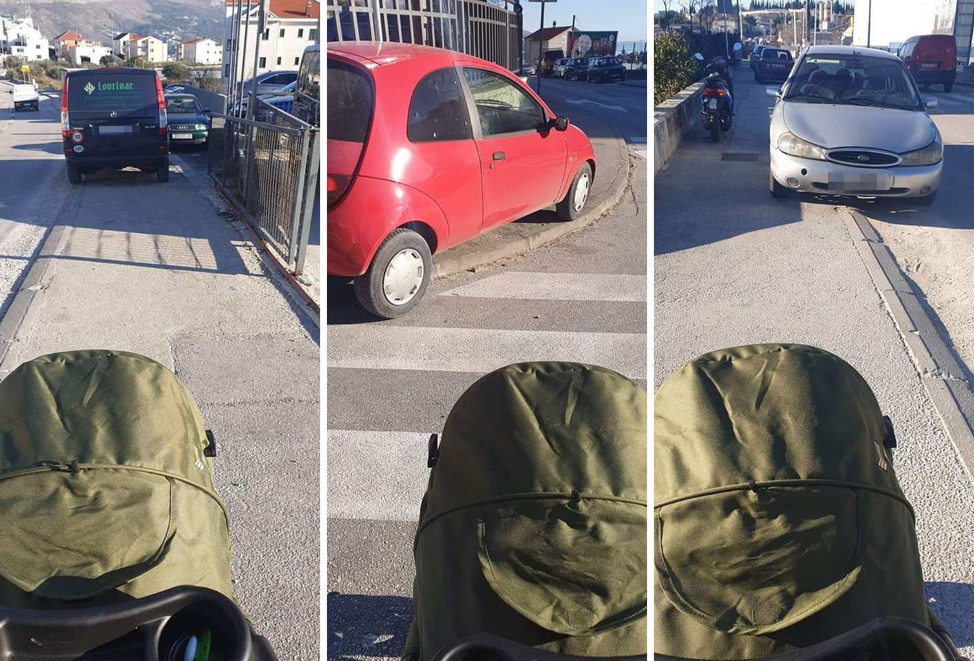 Jedan otac iz Splita požalio se na situaciju na koju sve češće nailazi u Splitu. Split "boluje" od kroničnog nedostatka parkirnih mjesta, no parkiranje automobila po nogostupu stvara druge vrste problema za pješake. Osobito su u nezavidnoj situaciji svi oni koji izađu u šetnju s kolicima za djecu, a zbog parkiranih vozila moraju izlaziti na opasni kolnik ili čak odustati od neke željene staze.