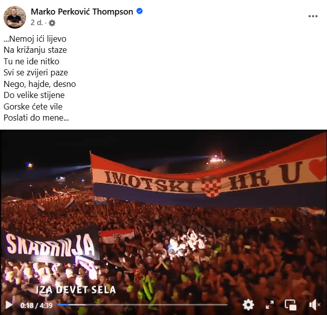 Naime, na dan izborne šutnje, u subotu, na Thompsonovoj službenoj stranici objavljene su čak dvije pjesme - "E moj narode" sa svim stihovima i pjesma "Iza devet sela" iz koje su istaknuti znakoviti stihovi o lijevoj i desnoj strani, skretanja, naravno.