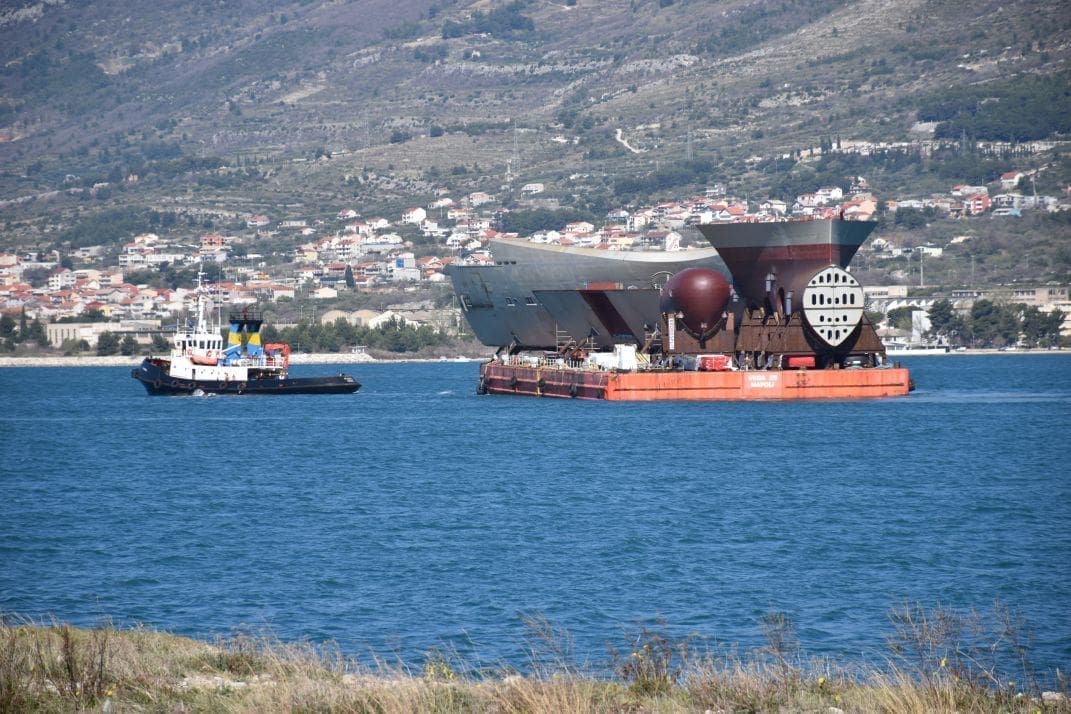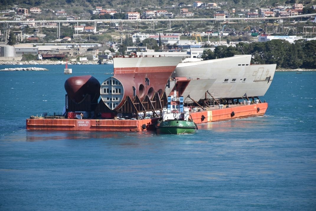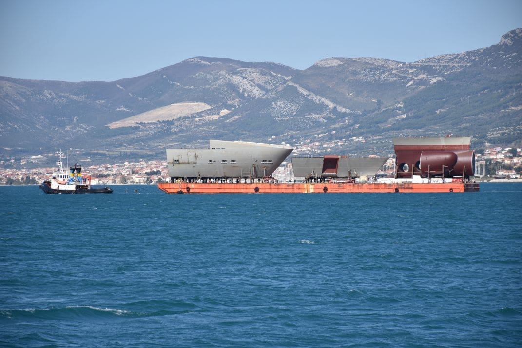 U Brodograđevnoj industriji Split ukrcajem na baržu za prijevoz specijalnih tereta obavljen je transport i isporuka opremljenih sekcija-velikih blokova pramčanog dijela trupa mega kruzera (cruiser).