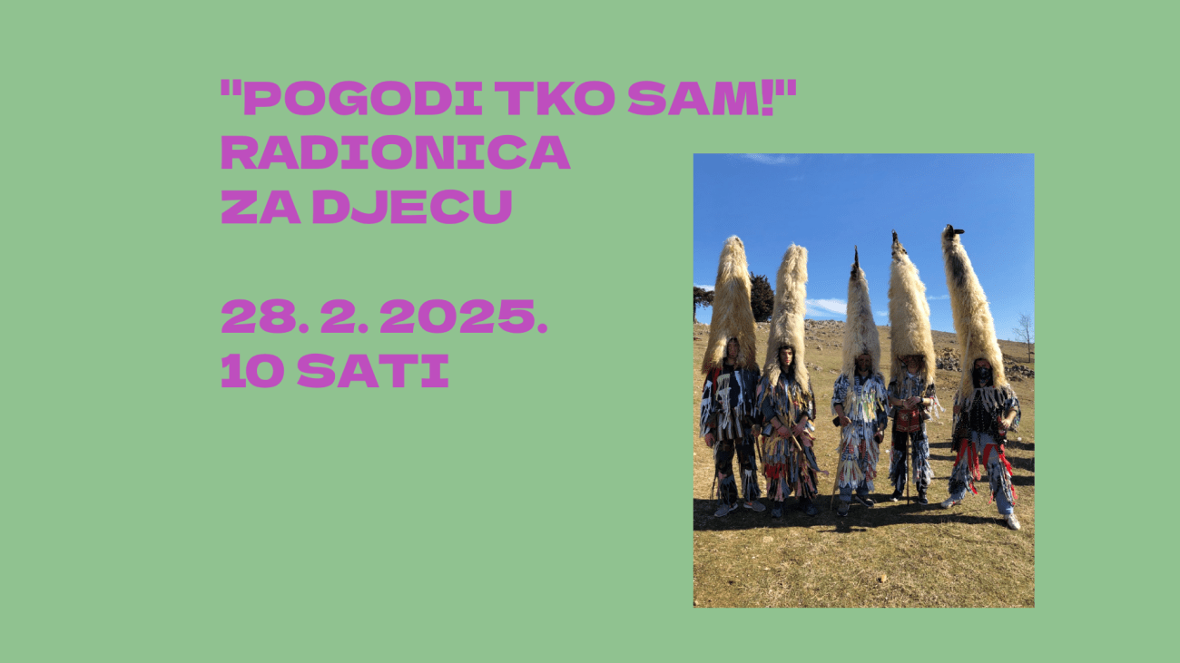 Nakon razgledavanja izložbe „Orilo, gorilo, ić' se mora” i upoznavanja sa zanimljivostima pokladnih običaja Splitsko-dalmatinske županije, slijedi muzejska radionica „Pogodi tko sam” na kojoj će djeca izrađivati svoje maske. Saznat ćemo i kada počinju poklade, od kojeg materijala su ljudi prije izrađivali maske, u koje likove su se maškarali i još puno toga.