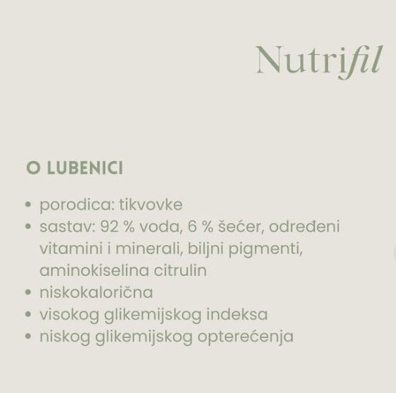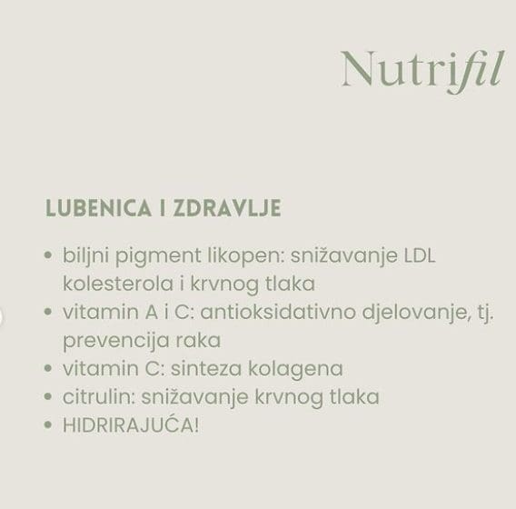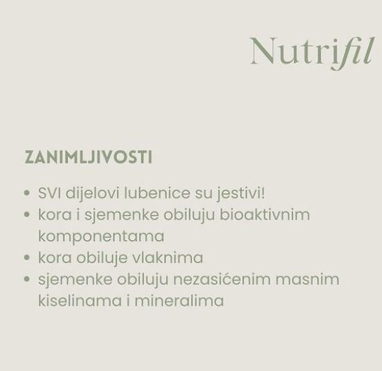 Uz prethodno navedene nutrijente u objavi (fotografijama poviše), lubenica sadrži i vitamin B6, kalij, fosfor, magnezij te beta karoten. S obzirom da je lubenica srodnik povrtnice krastavca u potpunosti je jestiva. Sjemenke lubenice sadržavaju magnezij, željezo i cink, a možete ih jesti sirove ili ispeći u pećnici pa ih konzumirati kao grickalicu. U nekim kulturama sjemenke lubenice koriste se i za pripravu čaja. Pri pripremi čaja možete koristiti jednu jušnu žlicu samljevenih ili isjeckanih sjemenki te pola litre kipuće vode. Nakon što procijedite sjemenke pustite da se čaj ohladi i dobili ste novi napitak za vruće ljetne dane", savjetuje mlada magistra Vanessa.