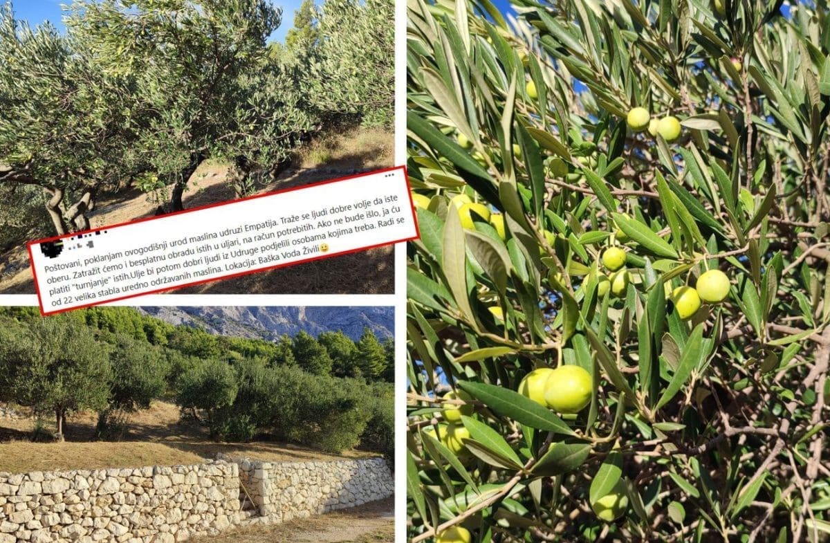 "Poklanjam ovogodišnji urod udruzi Empatija. Traže se ljudi dobre volje da iste oberu. Zatražit ćemo i besplatnu obradu istih u uljari, na račun potrebitih. Ulje bi potom dobri ljudi iz Udruge podijelili osobama kojima treba. Radi se o 22 velika stabla uredno održavanih maslina. Lokacija: Baška Voda", objavio je Dalmatinac na Facebook stranici udruge.