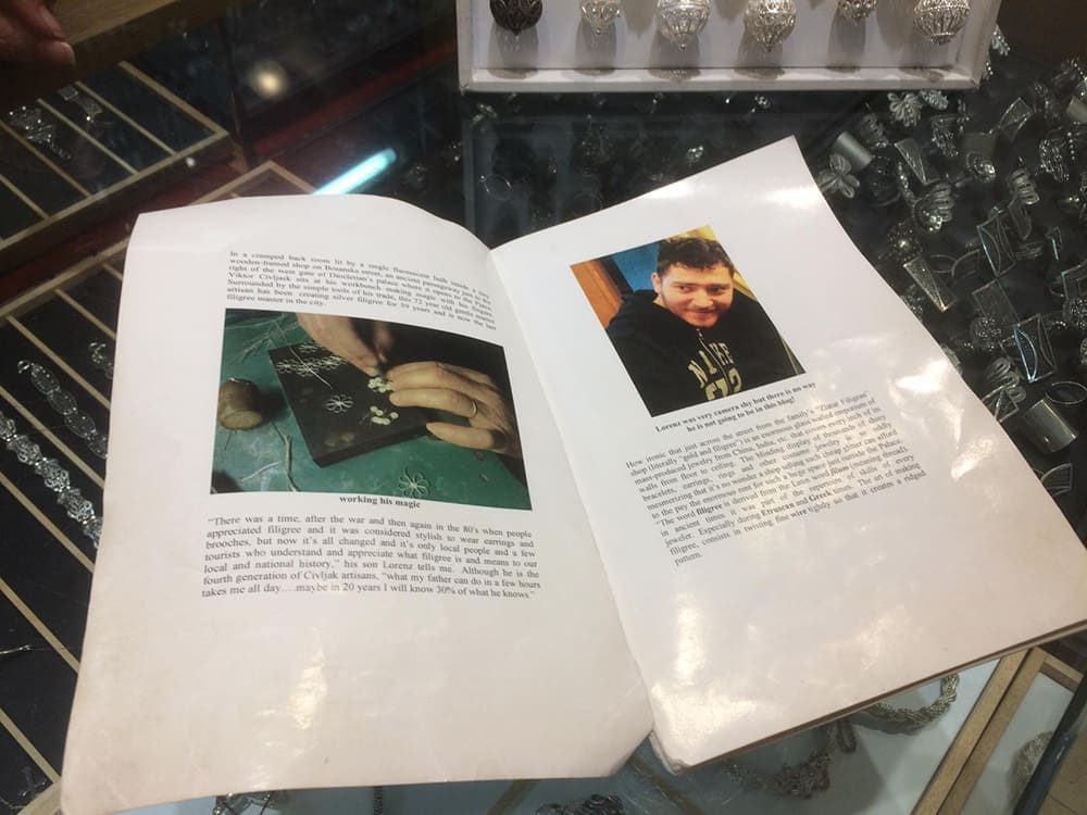 - Ne toliko naši novinari koliko strani. Došao nam je novinar iz Amerike i poklonio ovu knjigu (pokazuje knjigu o obiteljskom poslu na engleskom jeziku), stavio nas u neke časopise, ali mi se sami ne reklamiramo. Dođu u nas i vodiči s gostima, pričaju o našoj tradiciji, uđu kod mene iza, gdje radim, ja gostima napravim nakit ispred njih, a oni snimaju i slikaju. Tko zna koliko je fotografija otišlo u svijet. I zaista, na najpopularnijoj svjetskoj stranici za putnike TripAdvisoru, obitelj Čivljak kupi samo laude posjetitelja i kupaca.