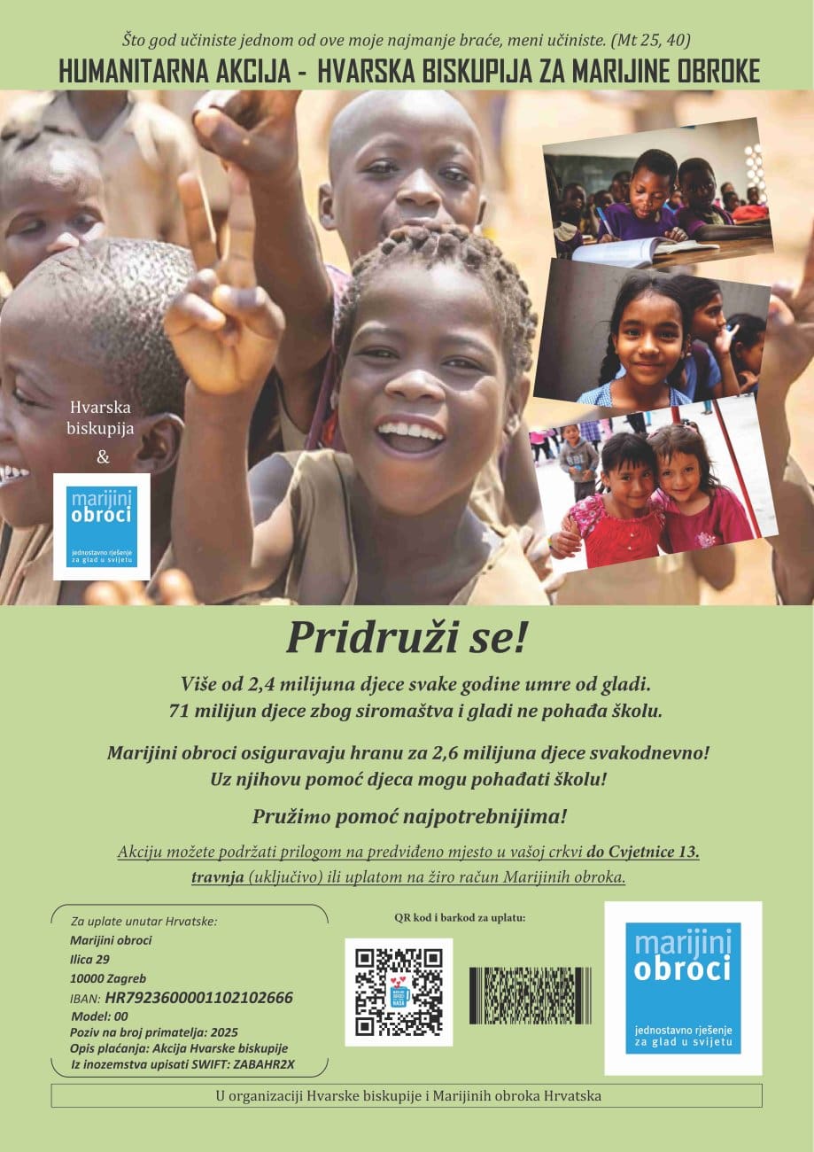 Hvarska biskupija pokrenula je humanitarnu akciju u korist međunarodne organizacije Marijini obroci, koja svakodnevno hrani i školuje milijune siromašne djece diljem svijeta. Akcija je odgovor na višekratne apele pape Franje koji ne prestaje pozivati vjernike i sve ljude dobre volje da pomognu onima kojima je pomoć najpotrebnija.