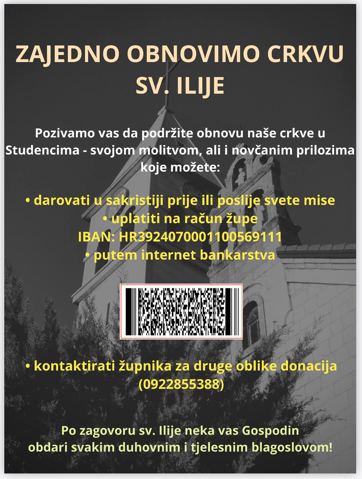 U Studencima je pokrenuta obnova župne crkve sv. Ilije, a radovi su već u tijeku. Iz župe su uputili javni poziv mještanima, ali i svima koji su na bilo koji način povezani s ovim krajem, da se uključe i pomognu dovršetak projekta.