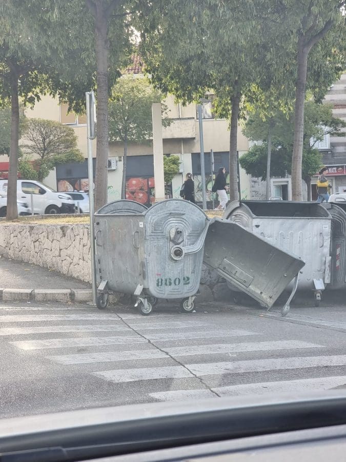 Naš čitatelj snimio je taj prizor, a kako je došlo do oštećenja metalnog kontejnera, nije nam poznato.
