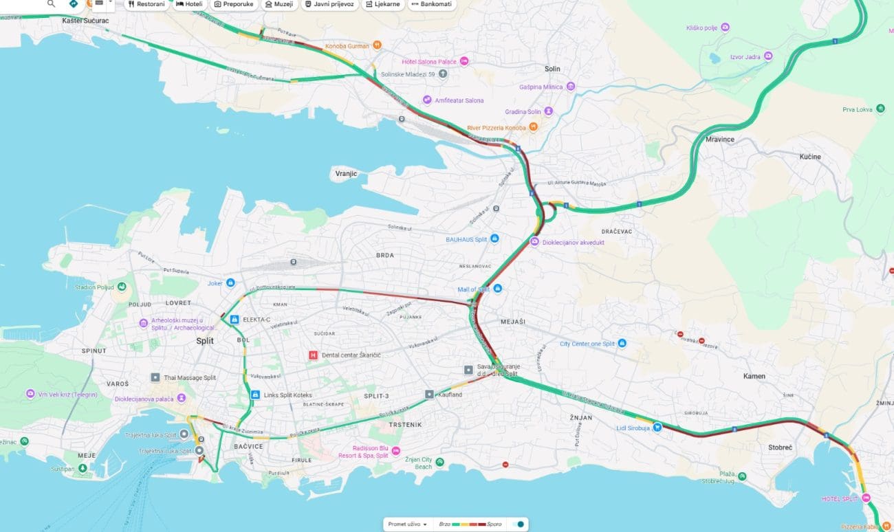 Ogromne gužve zabilježene su danas poslijepodne na izlazu iz Splita, posebno u Ulici Zbora narodne garde, gdje se prema Google Trafficu cijeli potez crveni — znak potpunog prometnog zastoja. Vozači javljaju o dugim kolonama, sporoj vožnji i nervozi koja raste iz minute u minutu.