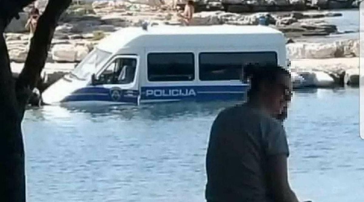 Nekoliko kupača, policijski čamac i - policijski kombi. Svi u moru.