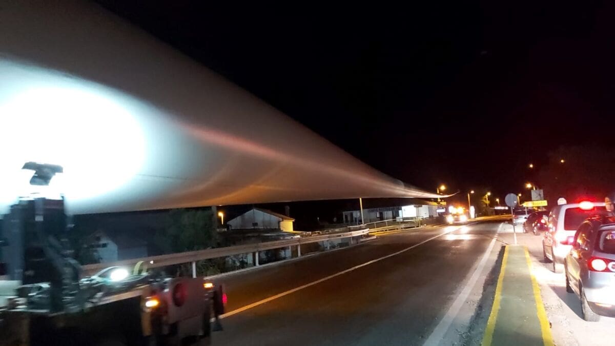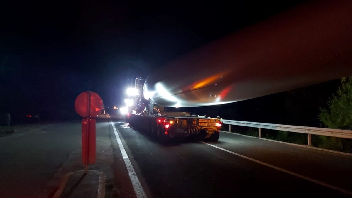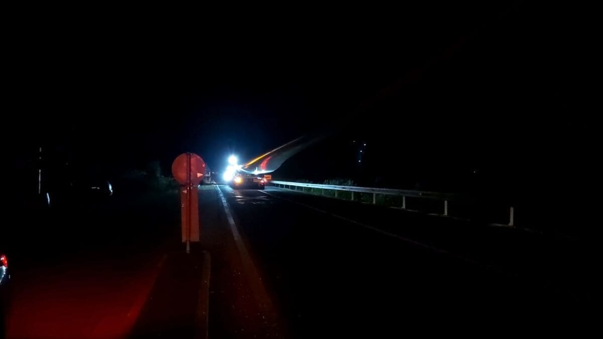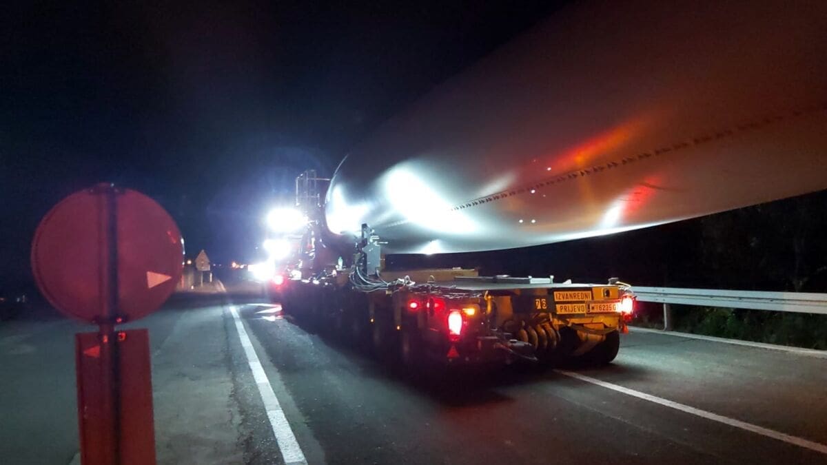 Policija je večeras isključila sve sudionike iz prometa da bi izvanredni prijevoz mogao proći. Kao što se može vidjeti, teretna vozila prijevoze elise vjetroelektrane.