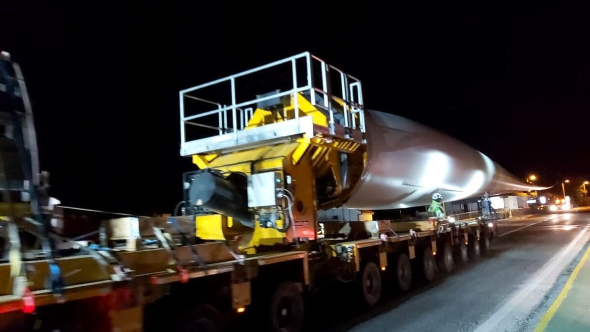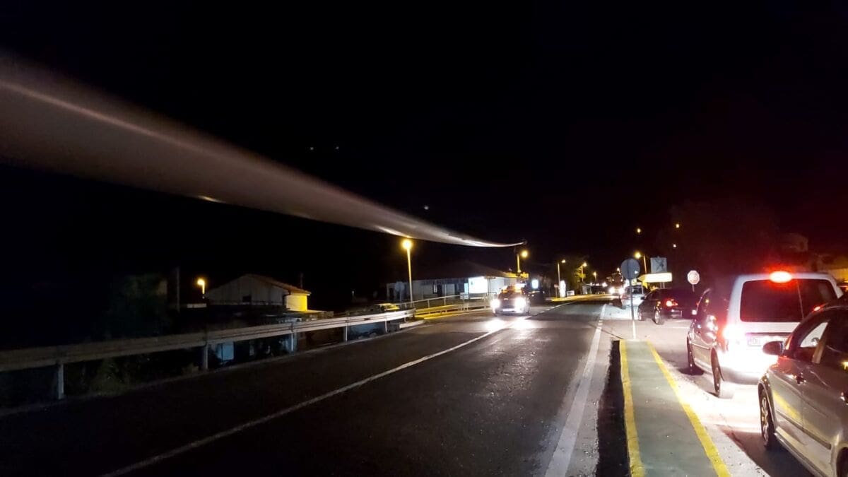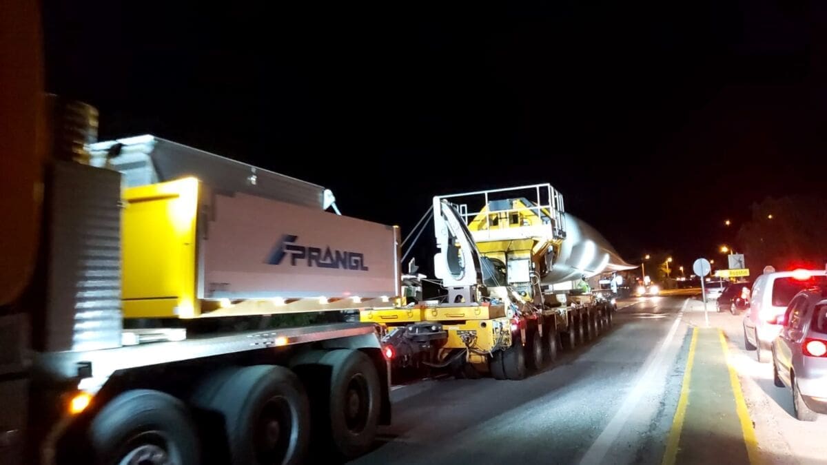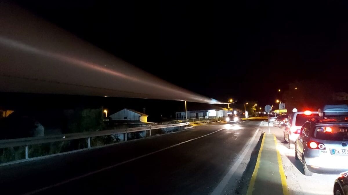 Policija je večeras isključila sve sudionike iz prometa da bi izvanredni prijevoz mogao proći. Kao što se može vidjeti, teretna vozila prijevoze elise vjetroelektrane.