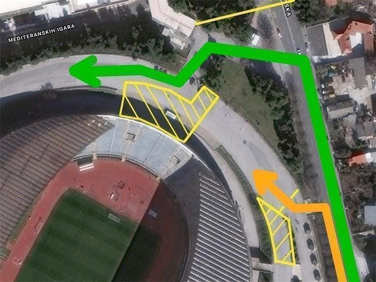 U cilju povećanja komfora posjetitelja sjeverne tribinu stadiona Poljud i kvalitetnijih uvjeta za rad redarske službe i policije, na javnom okupljanju - nogometnoj utakmici između HNK Hajduk i GNK Dinamo, koja će se održati u petak, 21. listopada 2022., organizator javnog okupljanja u suradnji s policijom, organizirat će drugačiji način ulaska na sjevernu tribinu i to na način da će se pregled ulaznica i gledatelja obavljati na vanjskim ulazima na šetnicu stadiona na šetnicu stadiona Poljud 3A i 3B (na slici označeno NARANČASTO), izvijestila je danas PU splitsko-dalmatinska.