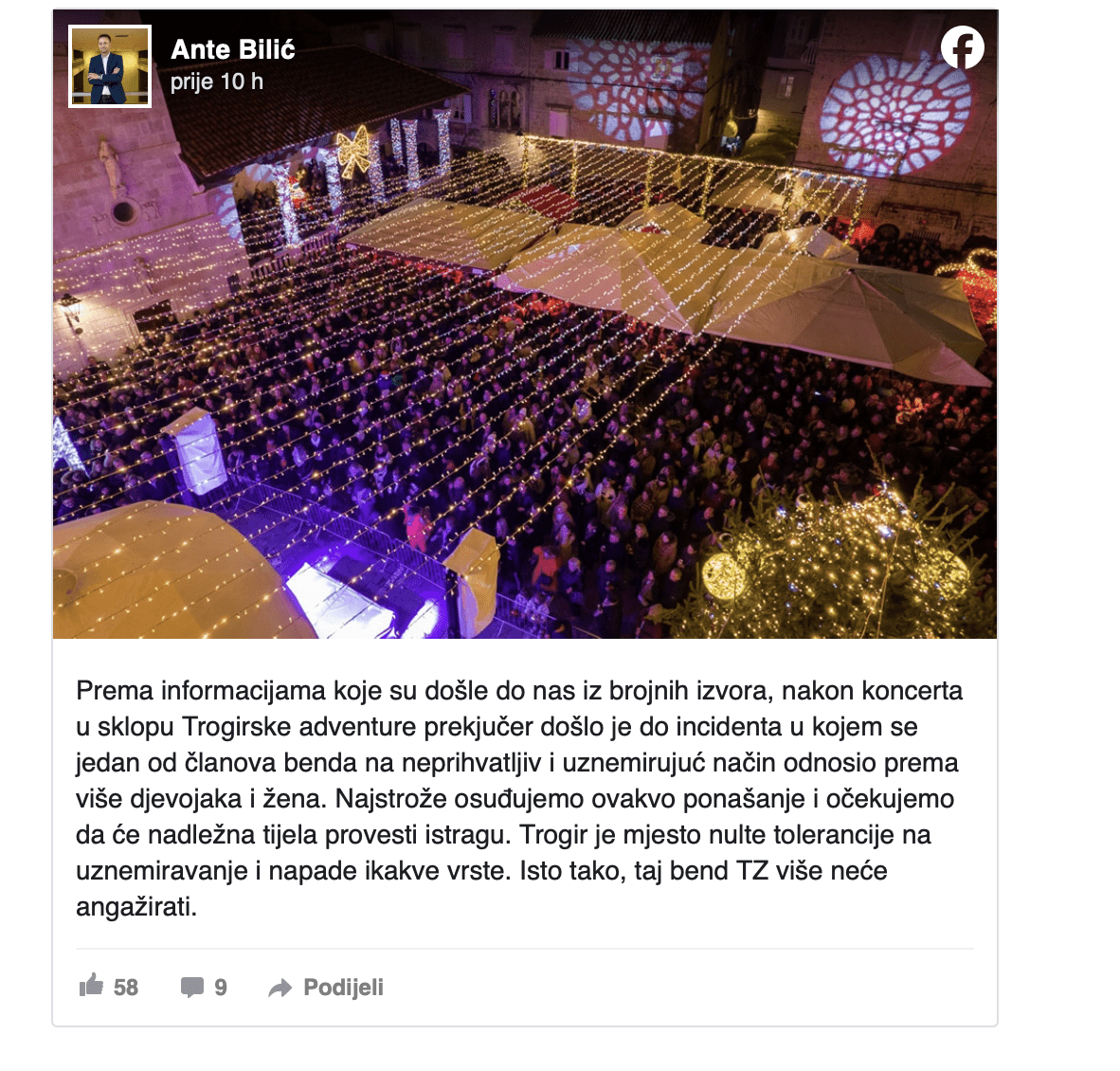 Prema informacijama koje su došle do nas iz brojnih izvora, nakon koncerta u sklopu Trogirske adventure prekjučer došlo je do incidenta u kojem se jedan od članova benda na neprihvatljiv i uznemirujuć način odnosio prema više djevojaka i žena. Najstrože osuđujemo ovakvo ponašanje i očekujemo da će nadležna tijela provesti istragu. Trogir je mjesto nulte tolerancije na uznemiravanje i napade ikakve vrste. Isto tako, taj bend TZ više neće angažirati.