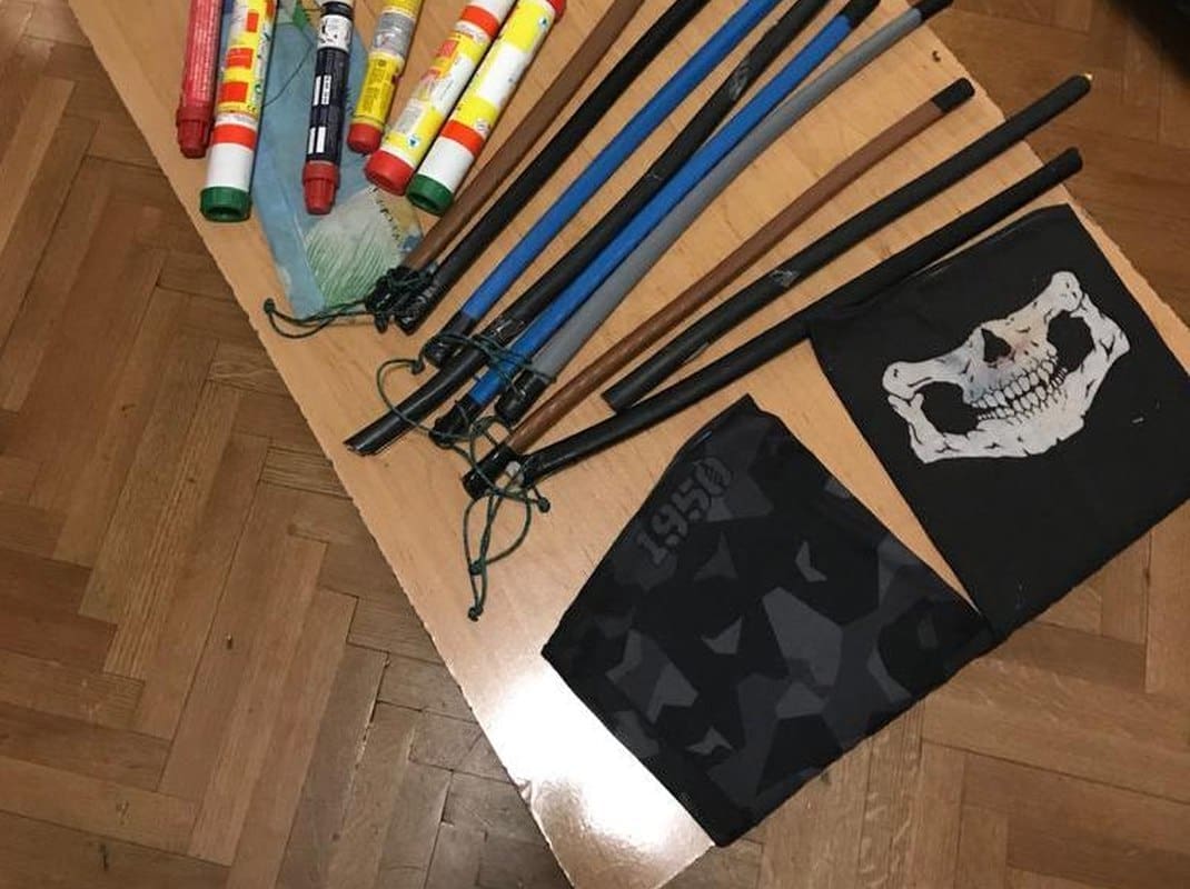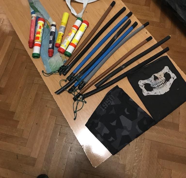 Obavljenim vizualnim pregledom utvrđeno je da se u vozilu nalaze predmetni pogodni za napad i pirotehnička sredstva radi čega je kombi prepraćen u prostor pod policijskim nadzorom gdje je u sklopu kriminalističkog istraživanja obavljena pretraga vozila u kojem je pronađeno 9 ručno izrađenih palica napravljenih za napad i nanošenje ozljeda, 6 pirotehničkih sredstava i dvije marame za prikrivanje identiteta.