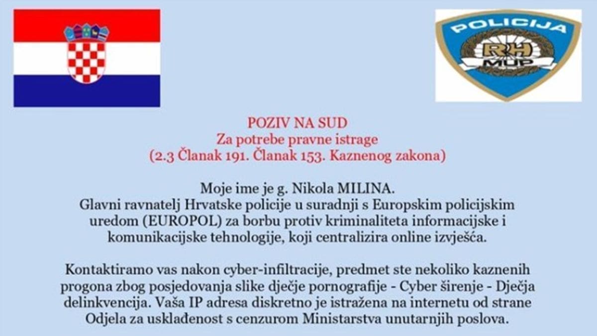 NA veći broj adresa elektroničke pošte različitih primatelja u Hrvatskoj dostavljena je LAŽNA PORUKA u kojoj se nepoznate osobe predstavljaju kao ministar unutarnjih poslova Davor Božinović, glavni ravnatelj policije Nikola Milina, načelnik Uprave kriminalističke policije Antonio Gerovac i načelnik Sektora općeg kriminaliteta i međunarodne policijske suradnje Dalibor Jurić te navode kako je primatelj poruke osumnjičen za više različitih kaznenih djela i traže od primatelja da odgovori na poruku, a sve s ciljem pribavljanja protupravne imovinske koristi, objavio je MUP, piše Index.