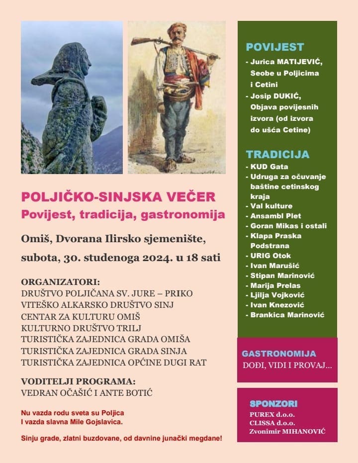 Dvorana Ilirskog sjemeništa u subotu 30. srudenog bit će domaćin jedinstvenog događaja pod nazivom Poljičko-sinjska večer, koja će spojiti povijest, tradiciju i gastronomiju ovih povijesno i kulturno bogatih krajeva. Početak programa predviđen je u 18 sati, a posjetitelje očekuje nezaboravna večer puna edukativnih predavanja, nastupa kulturno-umjetničkih društava i uživanja u autohtonim specijalitetima.