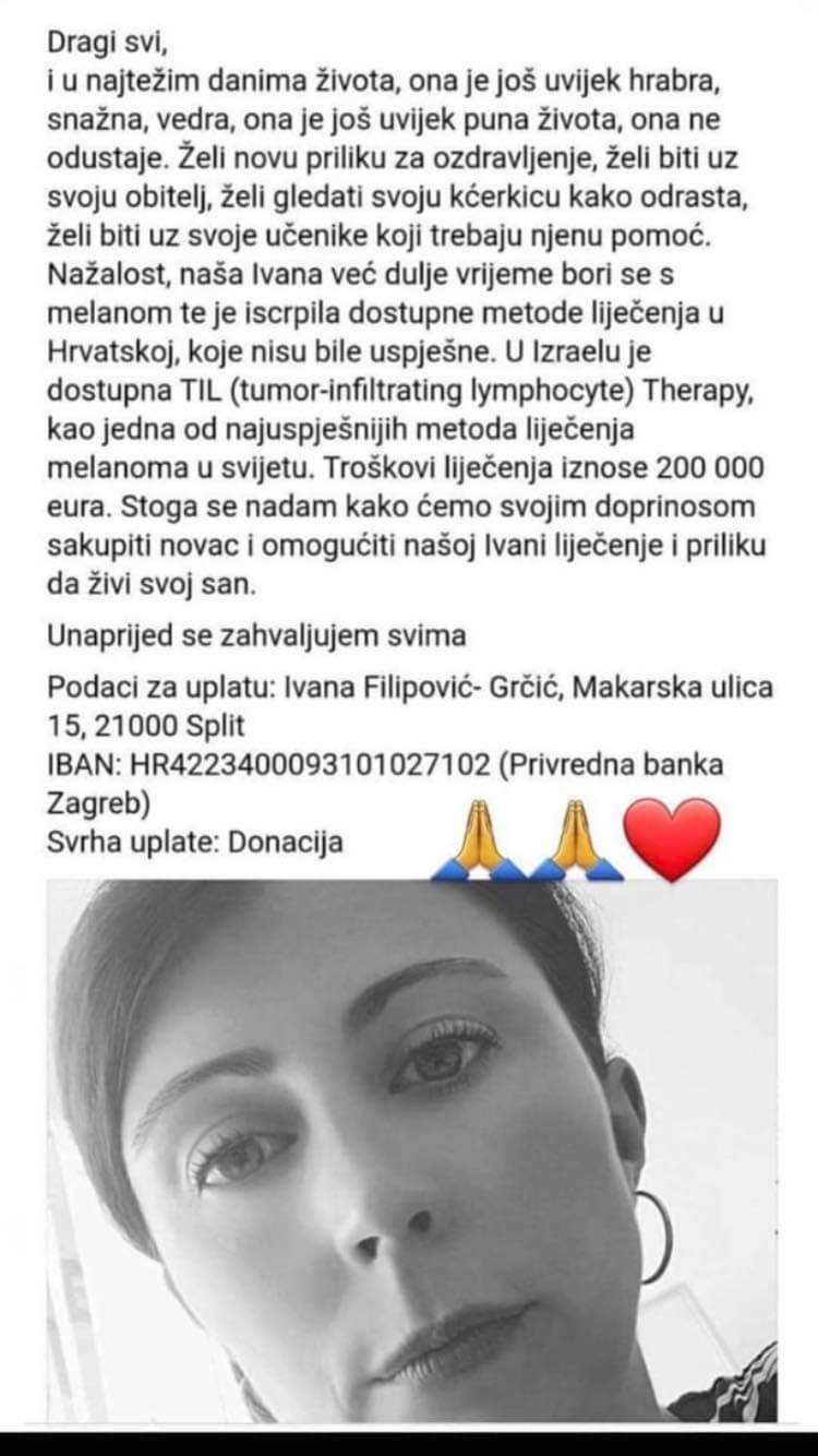 Ivana Filipović - Grčić je 38-godišnja Splićanka teško je oboljela prije nekoliko godina i od tada vodi tešku borbu s melanomom. Mladoj logopedica i majci osnovnoškolke dosadašnje liječenje u Hrvatskoj nije bilo uspješno.
